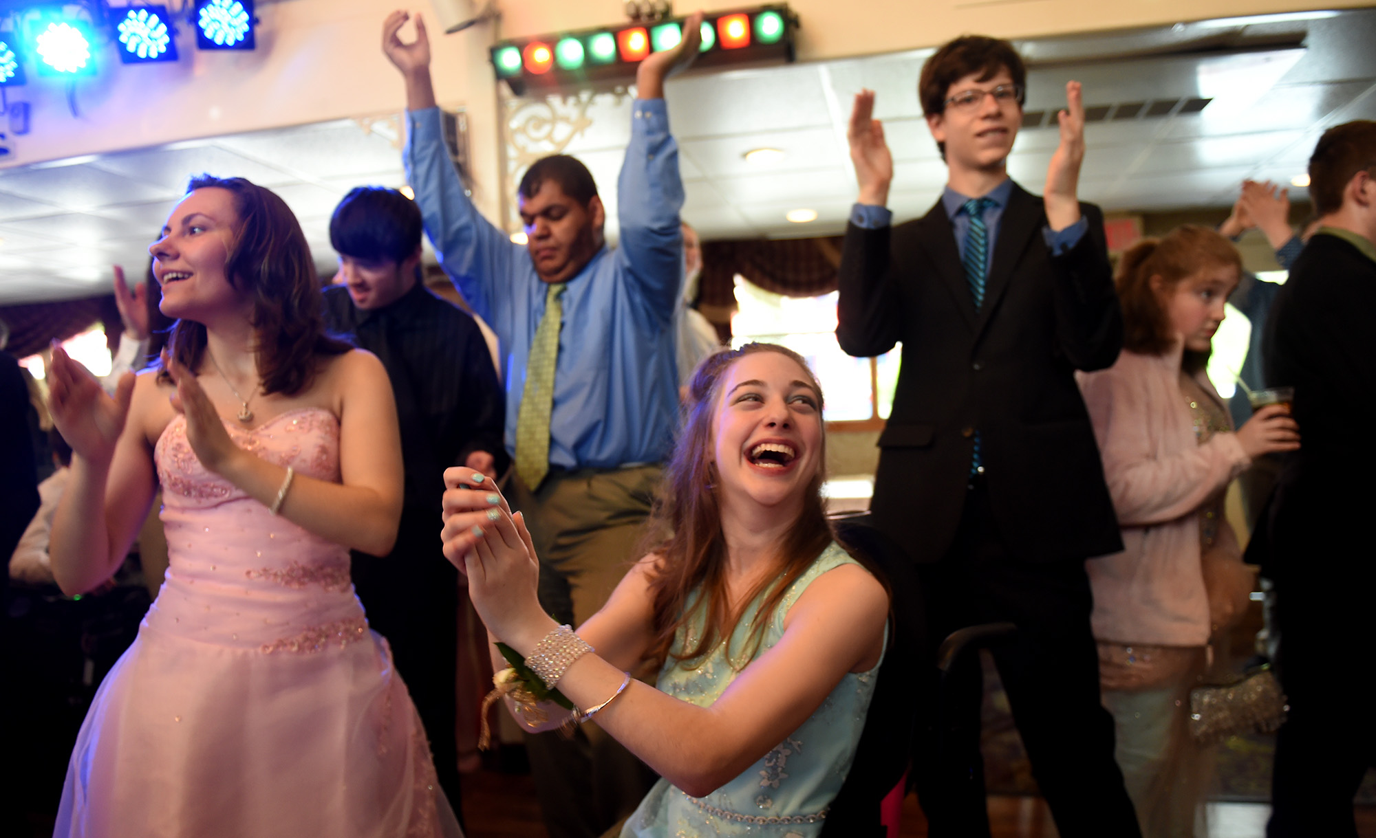 At center, Georgia Pardini, a junior at Keystone Oaks dances with, at left, Tori Campbell, a senior at Keystone Oaks and vice-president of the school’s Best Friends Club and Brady Morgan, a junior at Charters Valley during the S.T.A.R.S. Prom on the Gateway Clipper on the South Side Wednesday, May, 1, 2019 in Pittsburgh. Over 200 students from 15 area schools participated in the event that celebrates the individuality of all students while promoting inclusion and awareness. (Pam Panchak/Post-Gazette)
