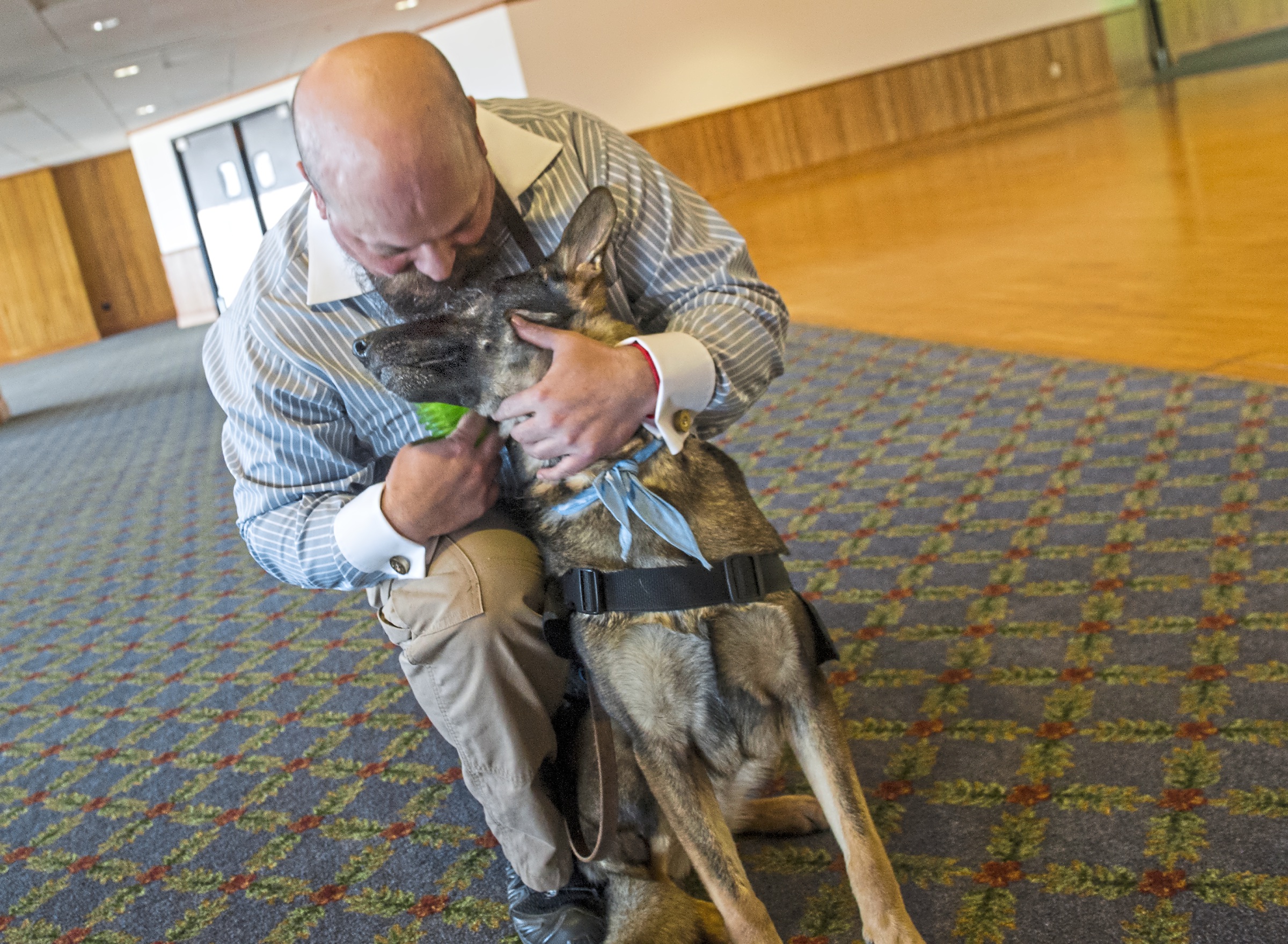 Dustin Schneider, 39, of Mt Washington cuddles with his service dog Spangler, a 3-year-old German Shepherd after the Passing of The Leash ceremony Tuesday, June 4, 2019 at Duquesne University. Guardina Angels Medical Service Dogs helped to match the dogs with their partners. (Lake Fong/Post-Gazette)