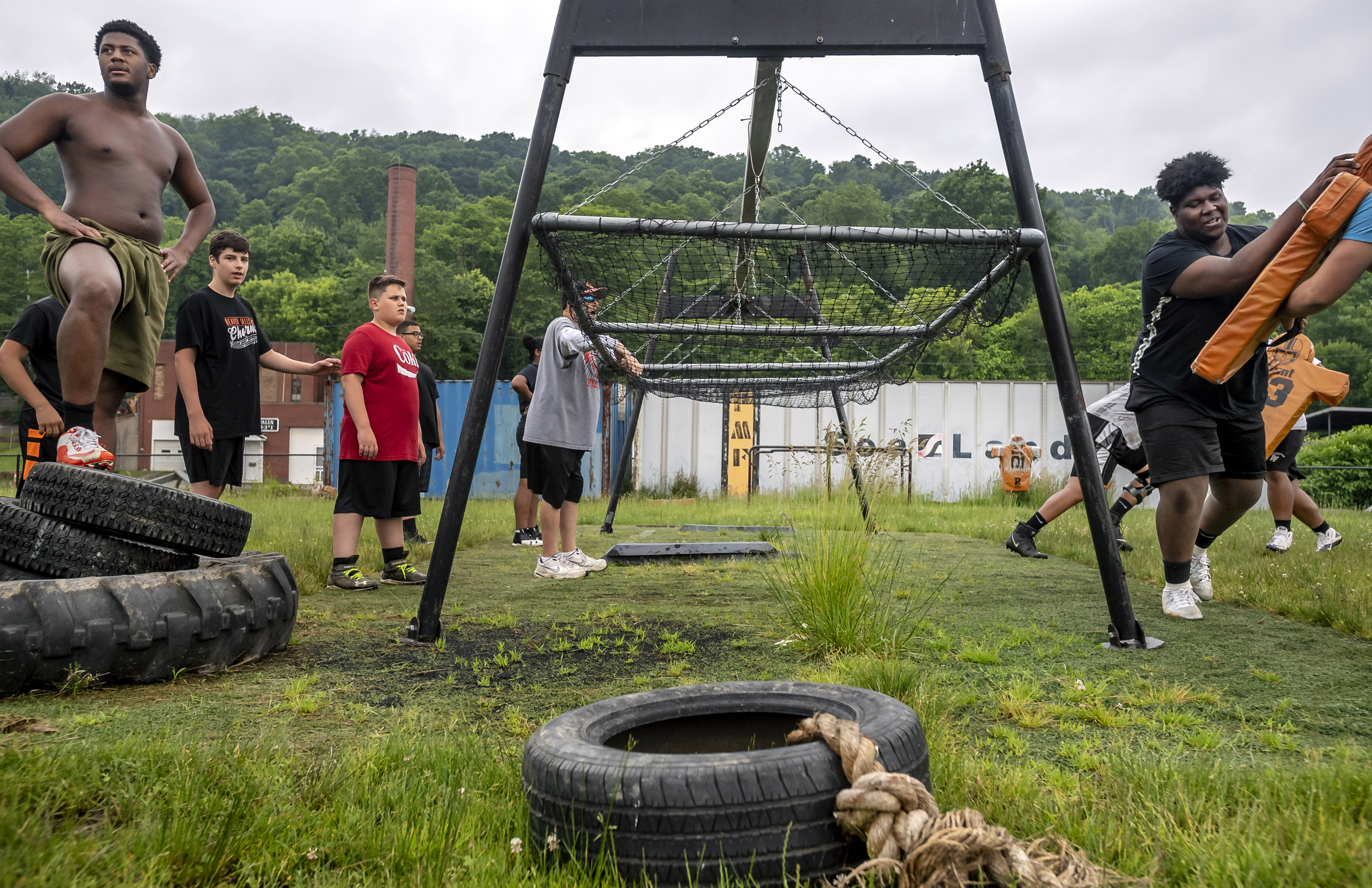 TAB 2019 Beaver Falls lineman Kyzer Cleckley stands on a stack of tires while catching his breath as lineman Tyrell Riggins works on his blocking technique during practice on Wednesday, June 5, 2019, at Beaver Falls High School. (Steph Chambers/Post-Gazette)