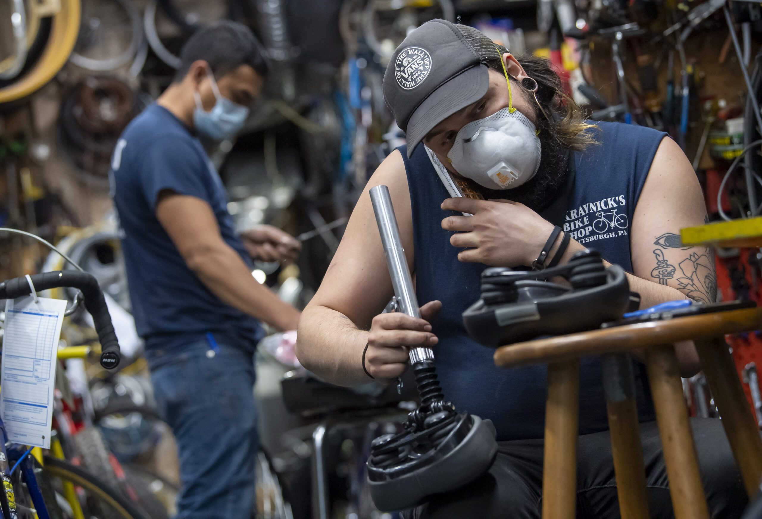 Mechanic Wyatt Morrus answers one of many phone calls on Wednesday, May 6, 2020, at Kraynick’s Bike Shop in Garfield. Kraynick’s Bike Shop has seen an increase in business during the COVID-19 pandemic. (Steph Chambers/Post-Gazette)