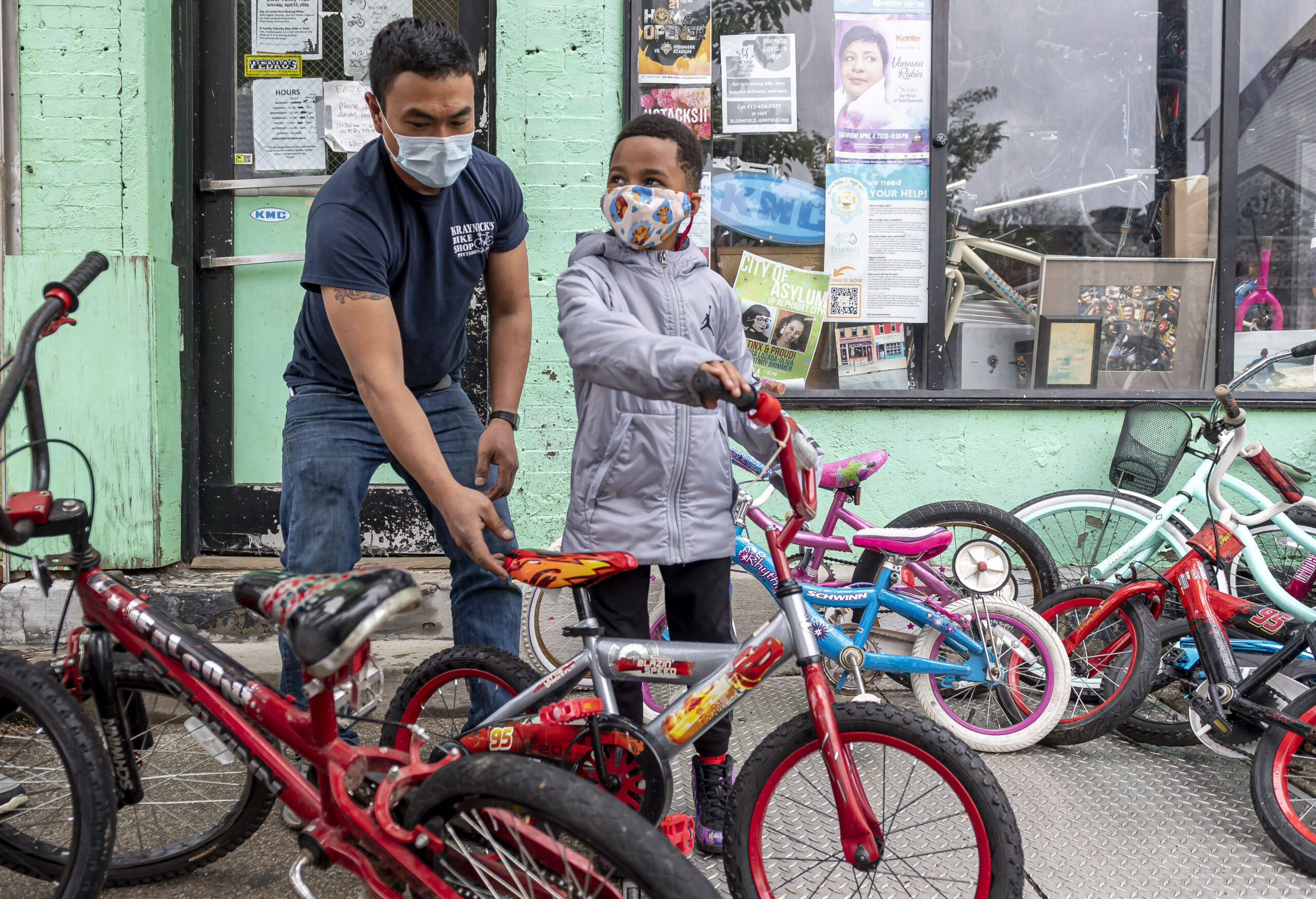 Owner Rocky Cristobal gives one of his recently repaired bikes to Loren Thomas, 7, of Bloomfield on Wednesday, May 6, 2020, at Kraynick’s Bike Shop in Garfield. Kraynick’s Bike Shop has seen an increase in business during the COVID-19 pandemic. The shop donates 250-400 kids bikes a year. (Steph Chambers/Post-Gazette)