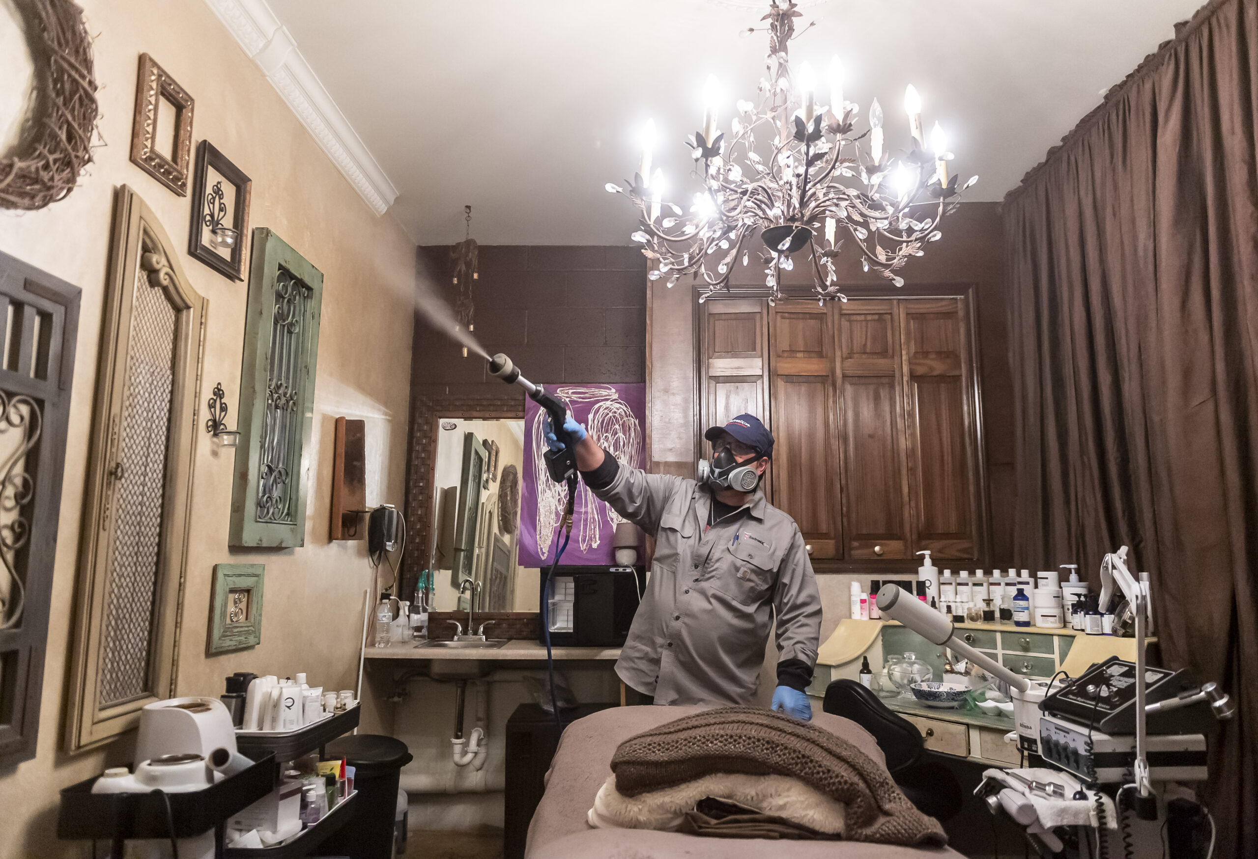 Bactronix service technician Ken Delisio sprays disinfectant Friday, May 8, 2020, at ESSpa Kozmetika Organic Day Spa and Skincare Salon in Aspinwall. The spa and salon business had been making big plans to re-open May 15th, which was originally set as a possible reopening day for Allegheny County. Gov. Wolf did not okay the county to reopen on that date at last Friday’s press conference, keeping it on “red” status. Co-owners Scott Kerschbaumer and his wife Eva Sztupka will open their business anyway. (Steph Chambers/Post-Gazette) #PGCovid19
