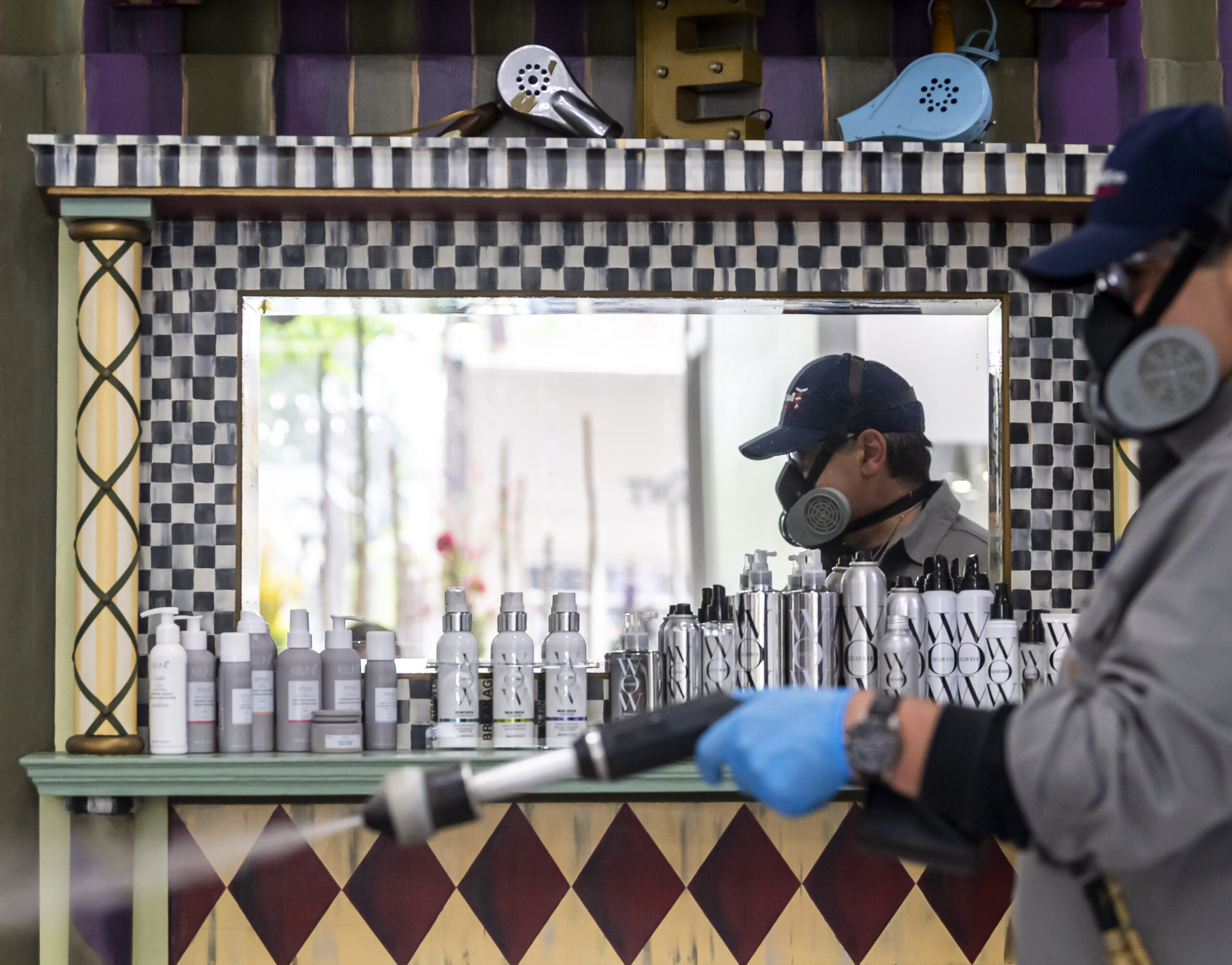 Bactronix service technician Ken Delisio sprays disinfectant Friday, May 8, 2020, at ESSpa Kozmetika Organic Day Spa and Skincare Salon in Aspinwall. The spa and salon business had been making big plans to re-open May 15th, which was originally set as a possible reopening day for Allegheny County. Gov. Wolf did not okay the county to reopen on that date at last Friday’s press conference, keeping it on “red” status. Co-owners Scott Kerschbaumer and his wife Eva Sztupka will open their business anyway. (Steph Chambers/Post-Gazette) #PGCovid19