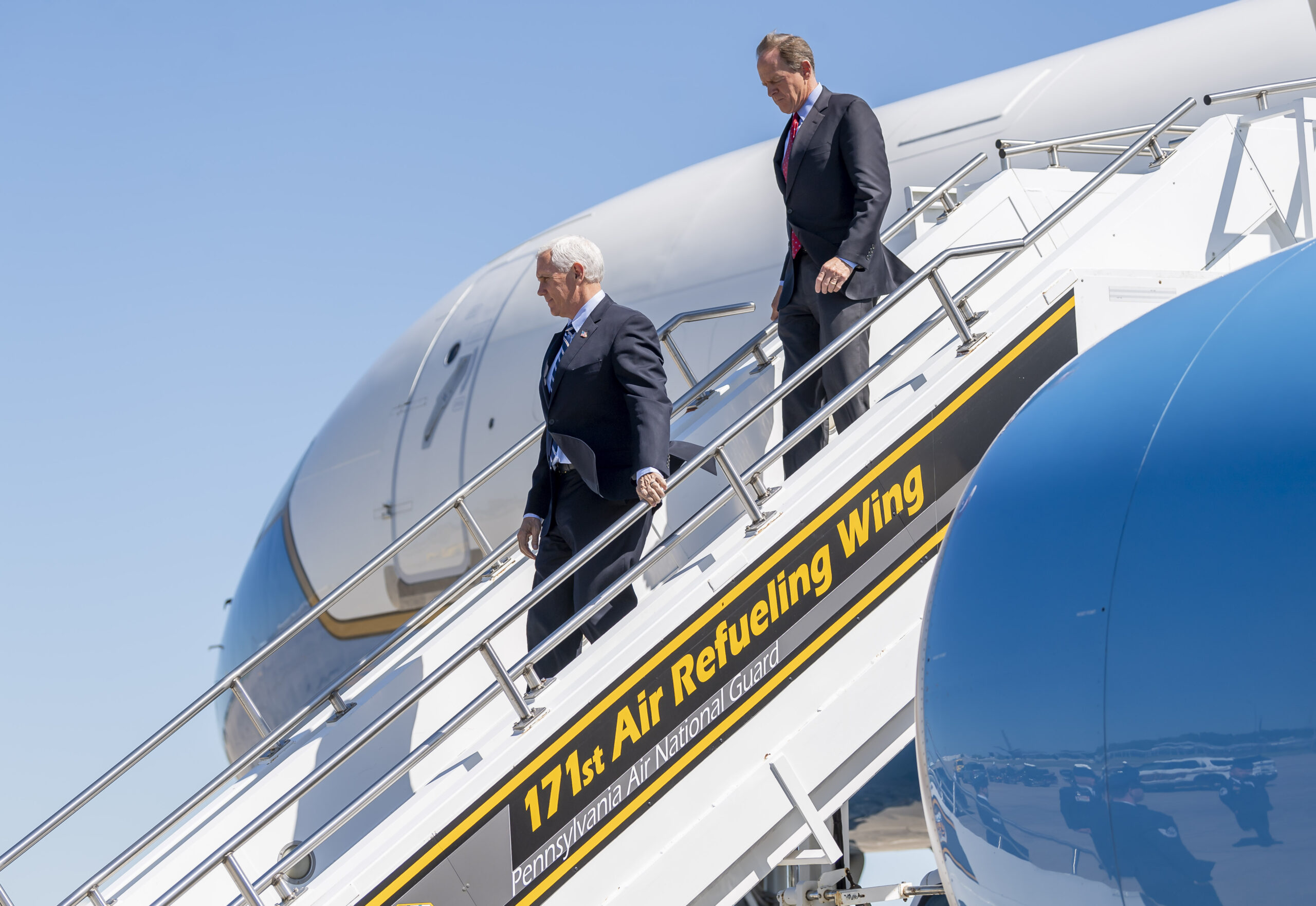 Vice President Mike Pence and U.S. Sen. Pat Toomey arrive at the 171st Air Refueling Wing of the Pennsylvania Air National Guard on Friday, June 12, 2020, in Coraopolis. Pence’s visit is the first stop part of the Great American Comeback Tour,” organized by America First Policies, a nonprofit that promotes the policy agenda of Donald Trumps re-election campaign. The tour’s guest speakers will discuss how businesses are recovering after the COVID-19 pandemic. (Steph Chambers/Post-Gazette)
