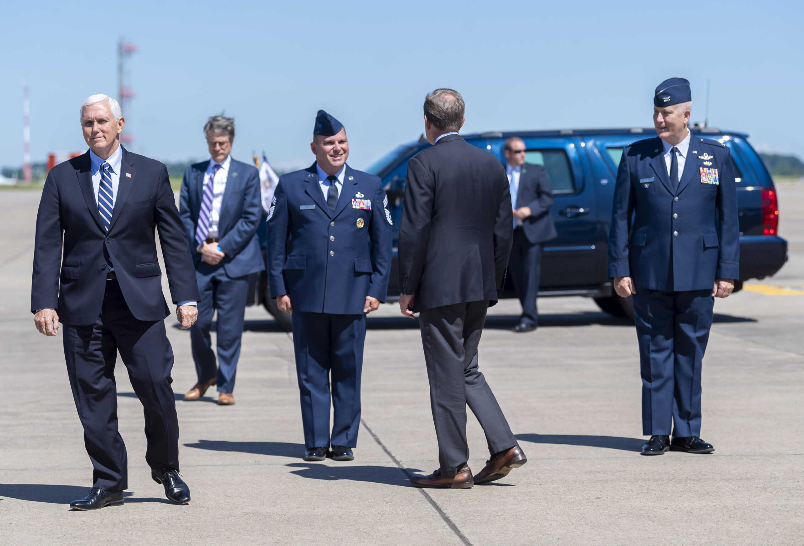 Vice President Mike Pence turns after he and U.S. Sen. Pat Toomey greet CMSgt. Andrew Bair and Col. Raymond Hyland at the 171st Air Refueling Wing of the Pennsylvania Air National Guard on Friday, June 12, 2020, in Coraopolis. Pence’s visit is the first stop part of the “Great American Comeback Tour,” organized by America First Policies, a nonprofit that promotes the policy agenda of Donald Trump’s re-election campaign. The tour’s guest speakers will discuss how businesses are recovering after the COVID-19 pandemic. (Steph Chambers/Post-Gazette)