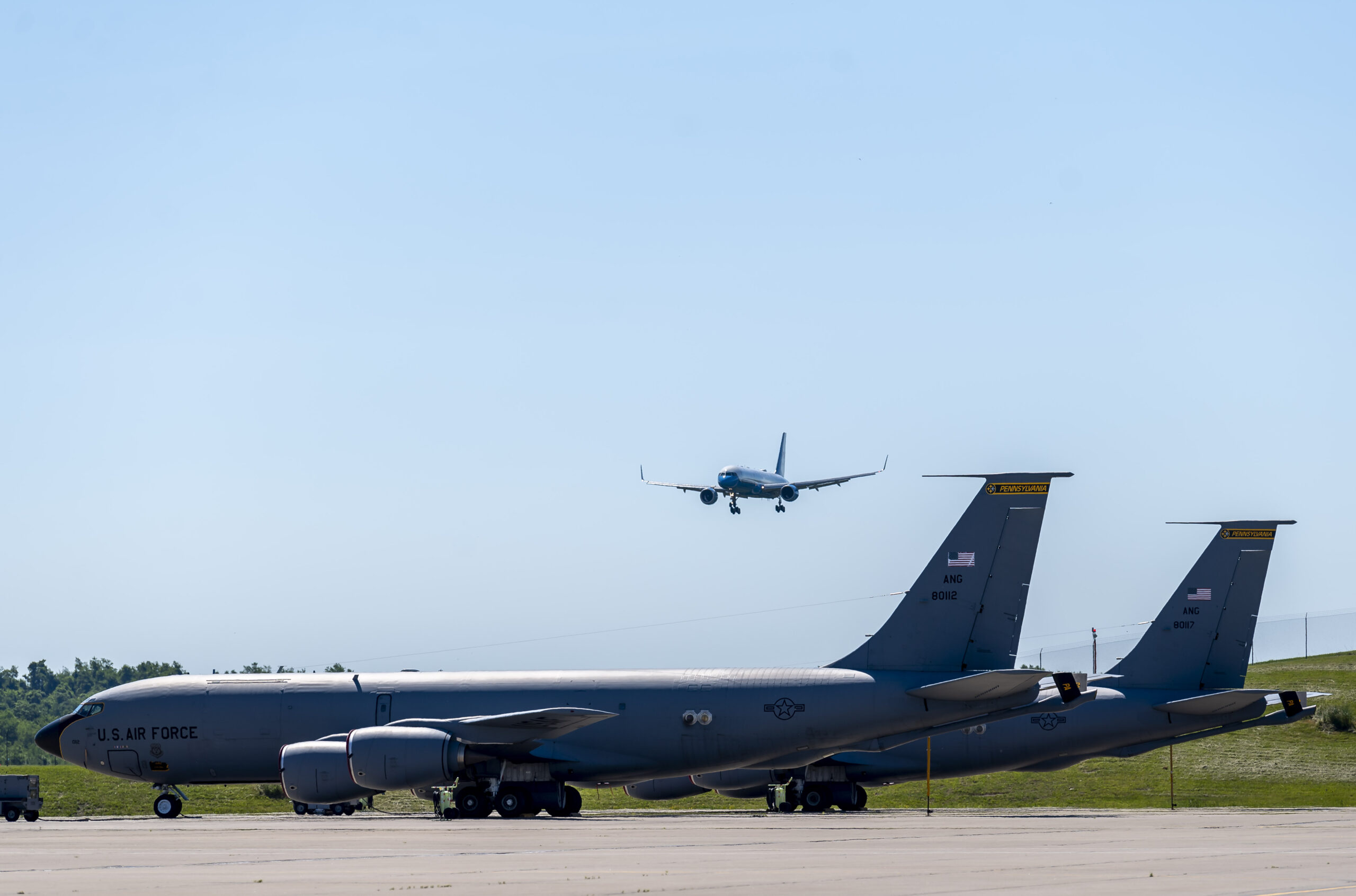 Air Force Two carrying Vice President Mike Pence and U.S. Sen. Pat Toomey arrives at the 171st Air Refueling Wing of the Pennsylvania Air National Guard on Friday, June 12, 2020, in Coraopolis. Pence’s visit is the first stop part of the “Great American Comeback Tour,” organized by America First Policies, a nonprofit that promotes the policy agenda of Donald Trump’s re-election campaign. The tour’s guest speakers will discuss how businesses are recovering after the COVID-19 pandemic. (Steph Chambers/Post-Gazette)