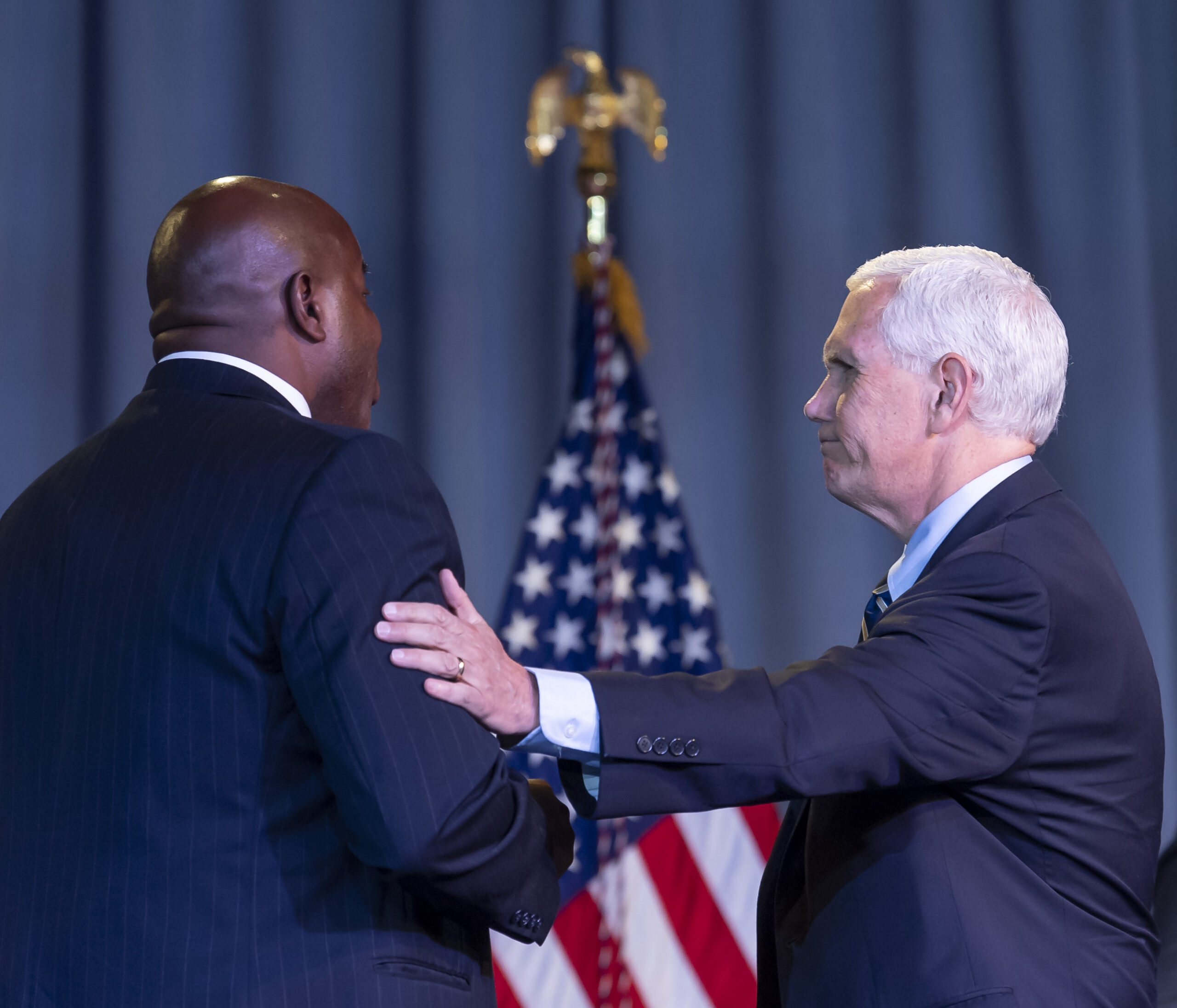 Pastor Ross Owens, Pastor of Allegheny Center Alliance Church, and Vice President Mike Pence greet one another after a session with faith and community leaders on Friday, June 12, 2020, at Covenant Church of Pittsburgh in Wilkinsburg. Pence’s visit is the first stop part of the Great American Comeback Tour,” organized by America First Policies, a nonprofit that promotes the policy agenda of Donald Trumps re-election campaign. The tour’s guest speakers will discuss how businesses are recovering after the COVID-19 pandemic. (Steph Chambers/Post-Gazette)