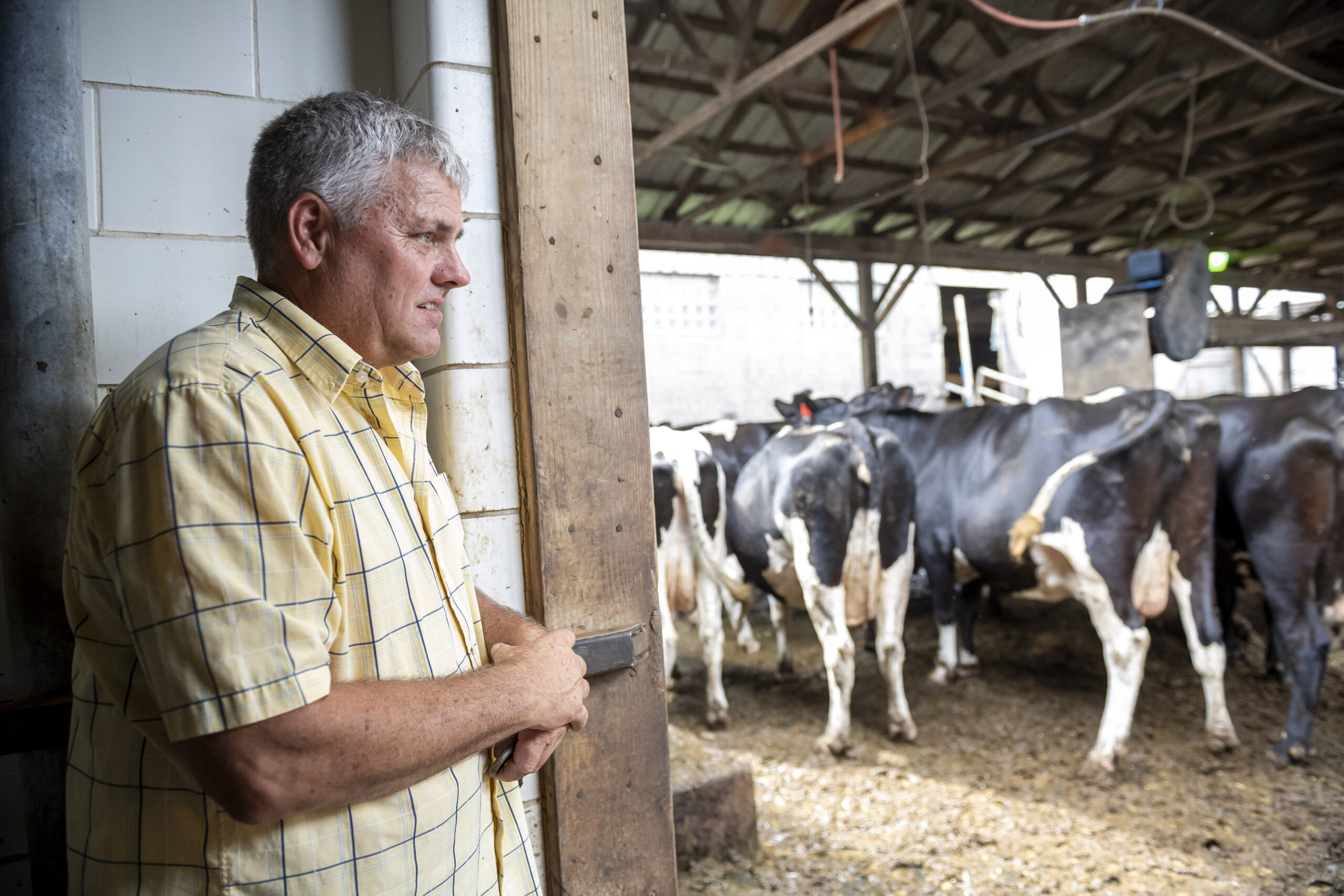 Rick Telesz, a Lawrence County farmer and Trump voter who says his third generation family farm has taken a hit from Trumps tariffs, looks at his Holstein cows on his 500-acre property on Wednesday, Aug. 12, 2020, in Volant. Telesz will speak at the Democratic National Convention next week on behalf of Joe Biden. (Steph Chambers/Post-Gazette)