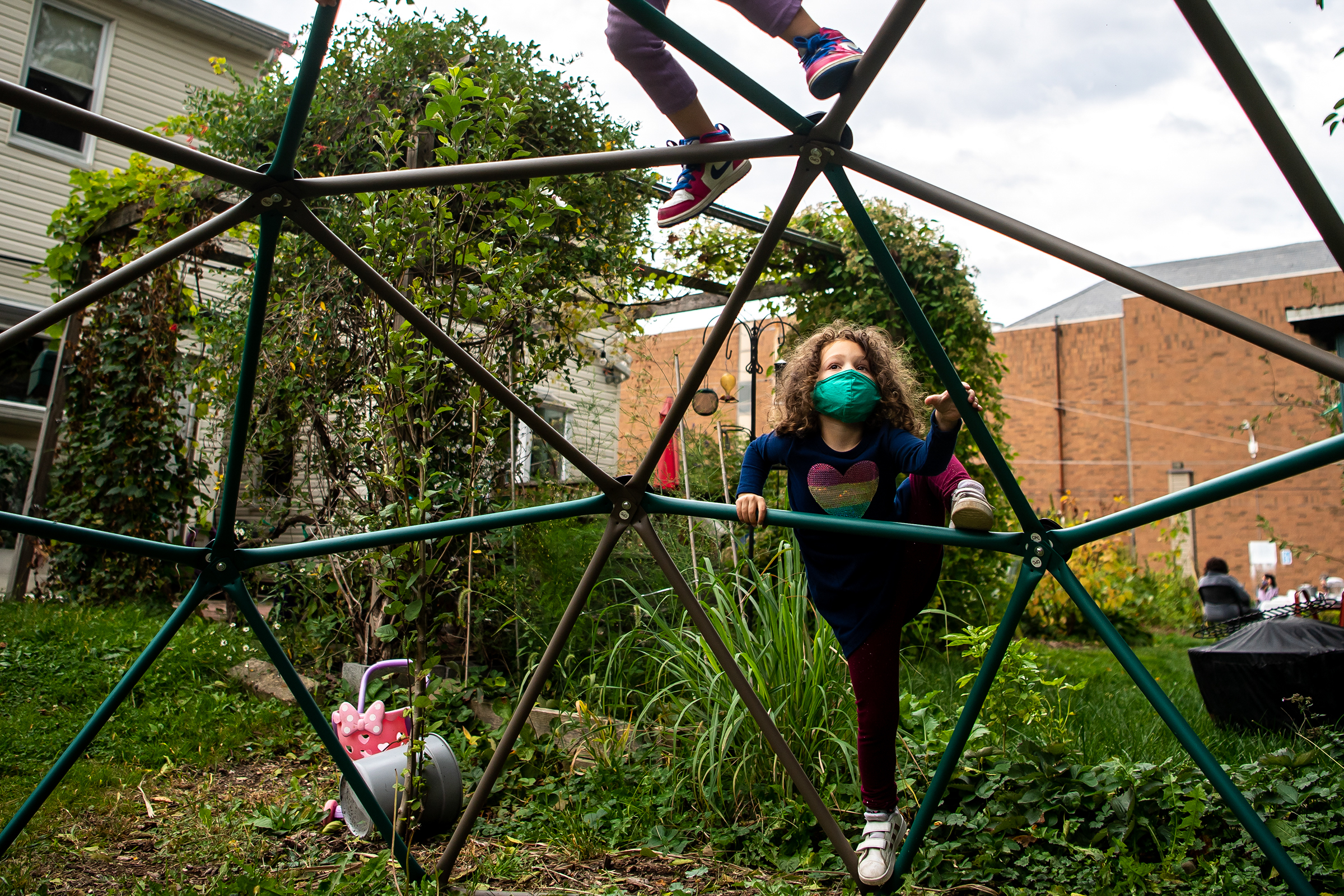 Francesca Wilkins Bienkowski, 5, of Squirrel Hill, whose shoes are showing, and Sophia Borg-Tuch, 5, of Shadyside, play on a jungle gym during “Fall Family Day”, hosted by the OMA Center for Mind, Body and Spirit’s Art in the Garden educational program, at Borland Garden in East Liberty, Sunday, Oct. 4, 2020. (Alexandra Wimley/Post-Gazette)