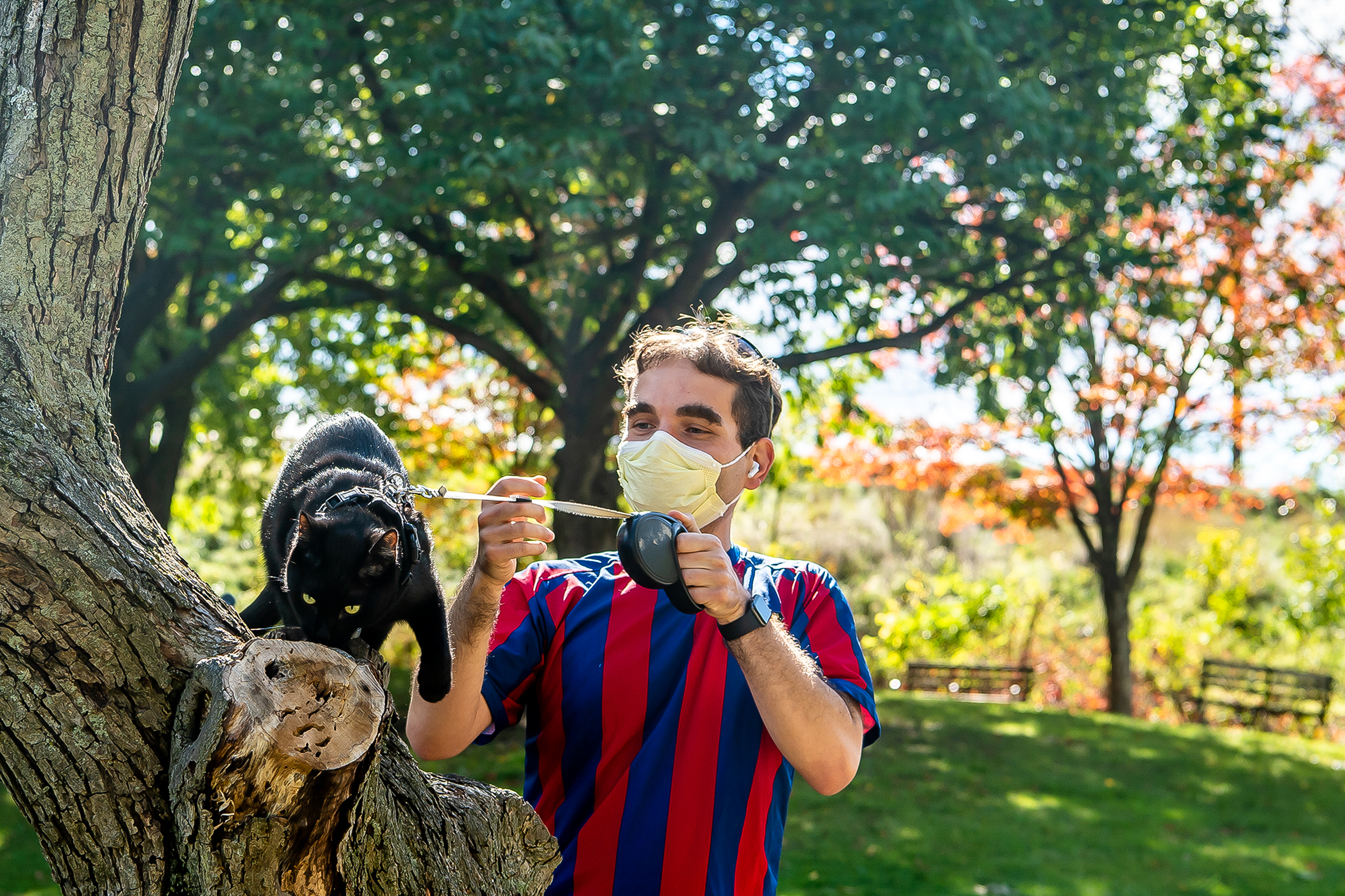 Adrian Accurso, of Squirrel Hill, lets his cat Bagheera explore a tree while walking him on a leash in Frick Park, Monday, Oct. 5, 2020, in Squirrel Hill. Mr. Accurso said Bagheera has been walking on a leash for three years, and he walks about a mile almost every day that the weather is good. (Alexandra Wimley/Post-Gazette)