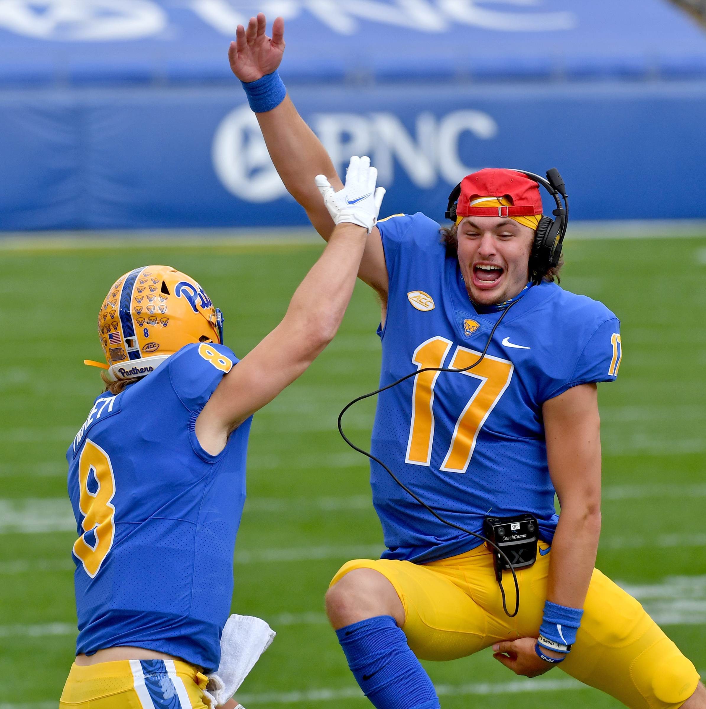 Pitt quarterback Kenny Pickett celebrates a touchdown throw to wide receiver Jordan Addison with backup quarterback Davis Beville against NC State in the first quarter at Heinz Field, Saturday, Oct 3, 2020, in Pittsburgh. (Matt Freed/Post-Gazette)