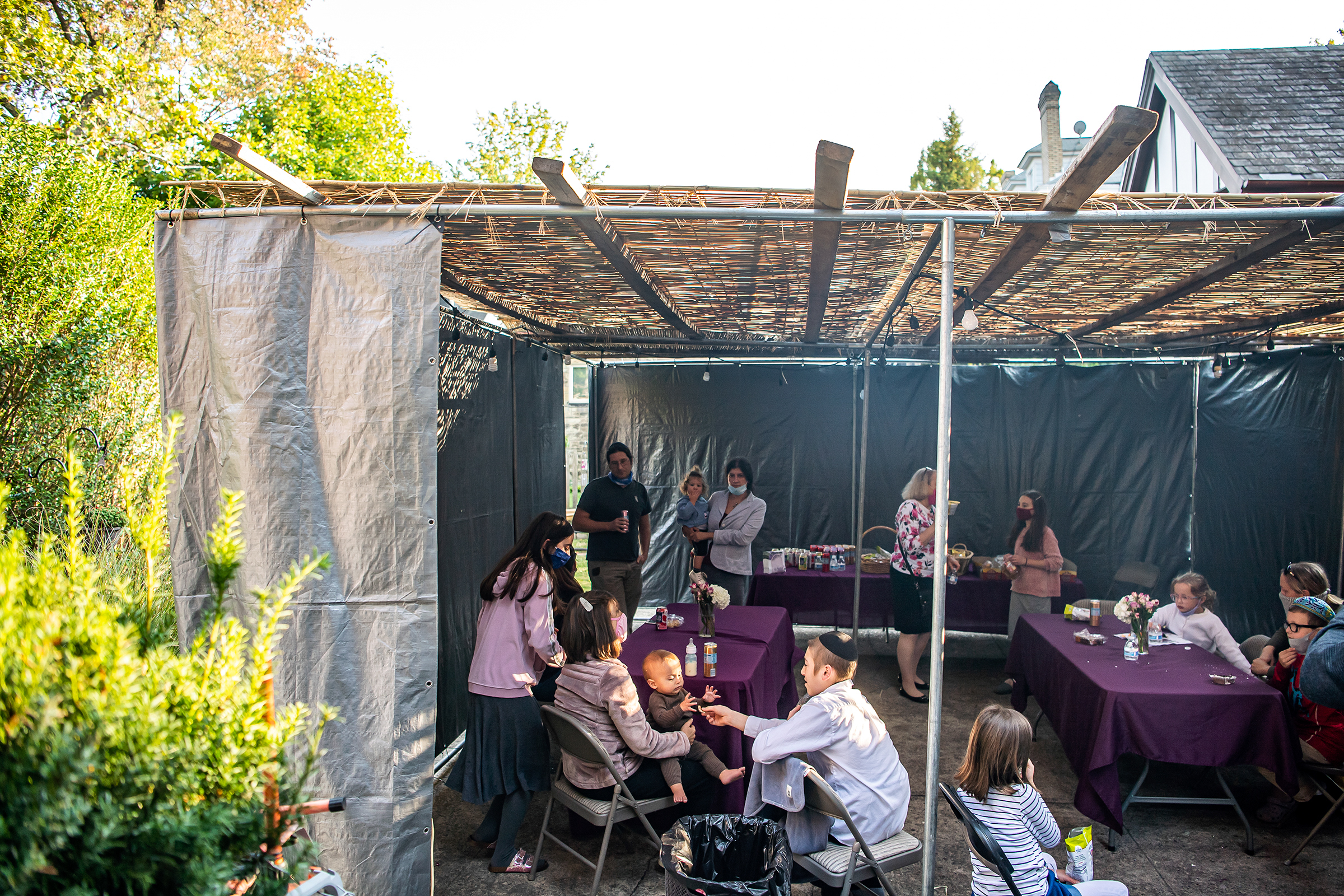 People visit with each other and eat snacks during a visit to the sukkah, a temporary shelter with a roof that is partially open to the sky used to celebrate the weeklong Jewish holiday Sukkot, in the yard of Rabbi Yisroel Altein, of Chabad of Squirrel Hill, Tuesday, Oct. 6, 2020. In past years Rabbi Altein would host large gatherings of several families at the sukkah, but this year due to COVID-19 precautions, he’s inviting families to visit in 30 minute shifts to maintain social distance. (Alexandra Wimley/Post-Gazette)