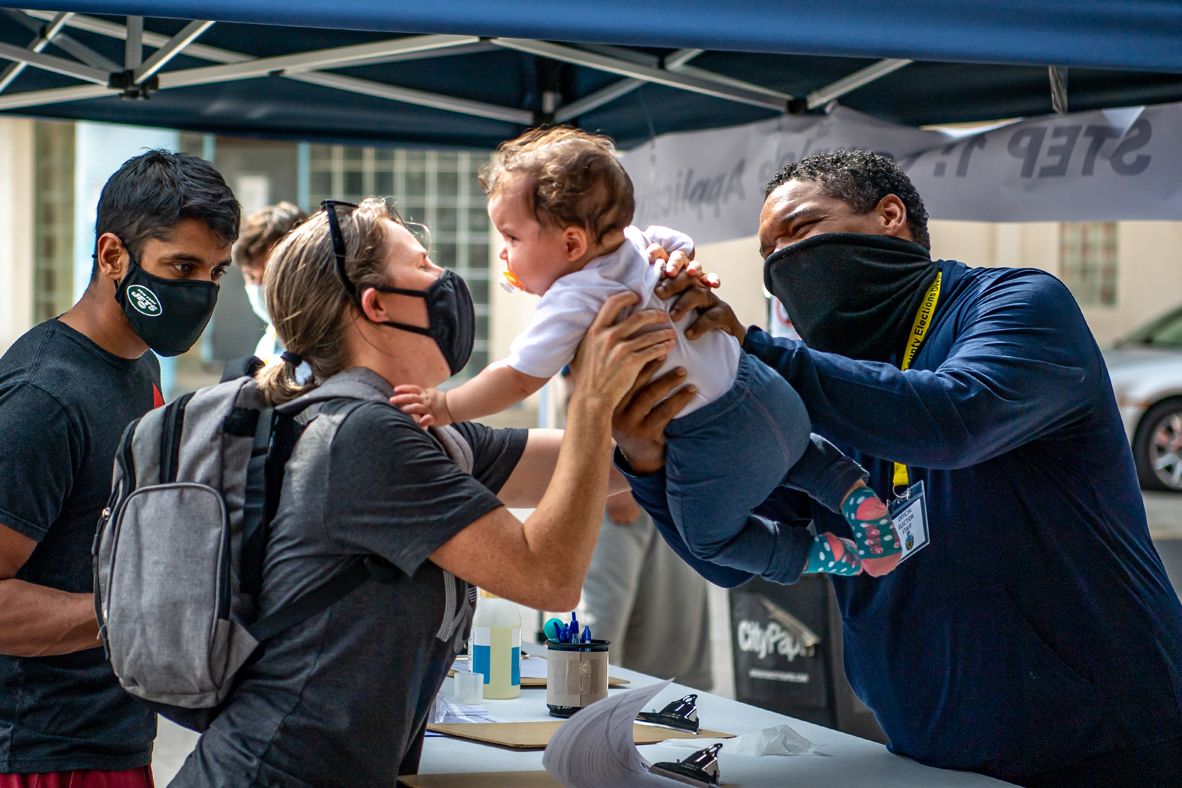 Aaron Thomas, of Penn Hills, right, a poll worker with the Allegheny County Elections Division, hands Sarla Devaraj, 1, center, back to her mother Susan Deveraj, of Stanton Heights, as her father Vivek Deveraj looks on, after Mr. Thomas held Sarla so her parents could complete their ballots outside of the satellite election office and mail-in ballot drop-off location at the CCAC Homewood-Brushton Center, Saturday, Oct. 10, 2020, in Homewood. This location was holding a “pop-up party weekend” offering food, live music, and voter information tents. (Alexandra Wimley/Post-Gazette)