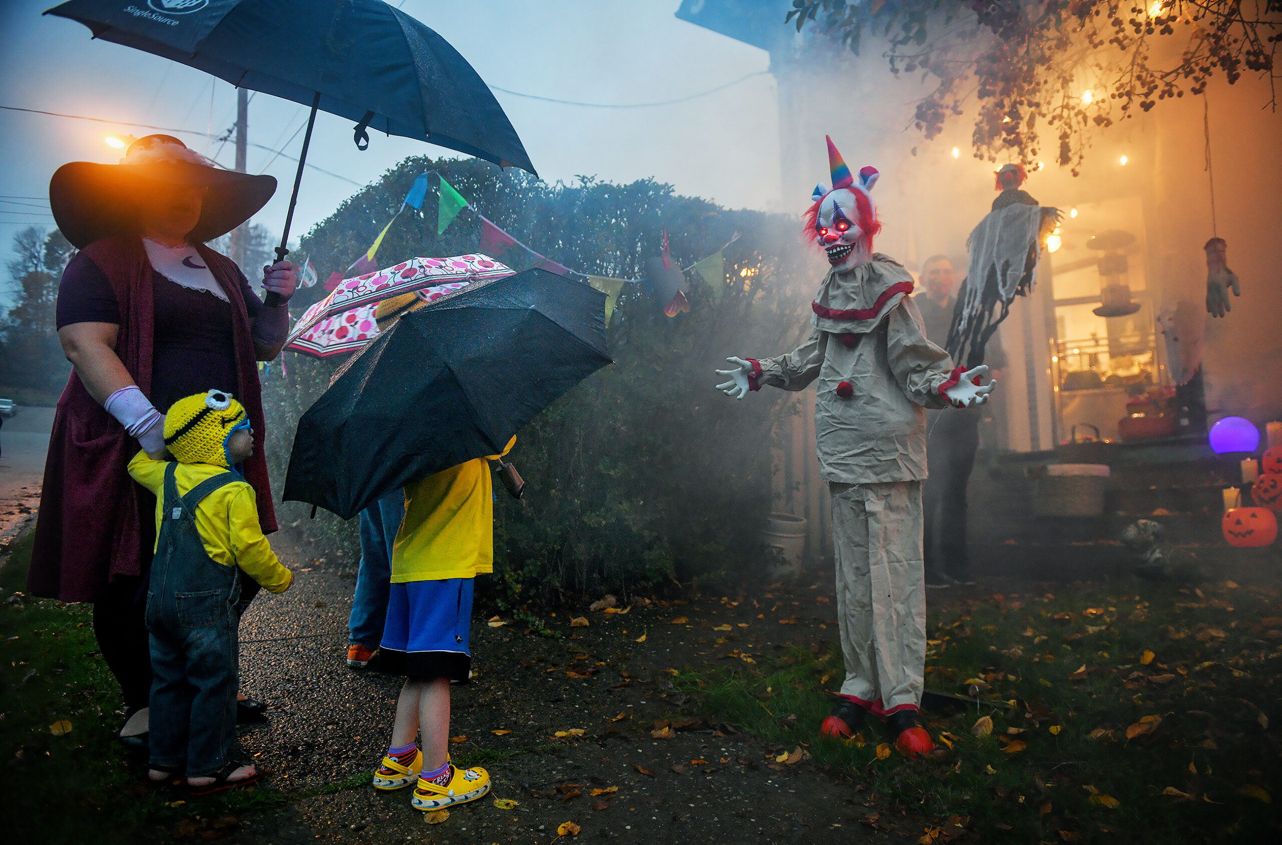 A creepy Halloween display caught the attention of trick-or-treaters at Brian Sables house at the intersection of Vance Avenue and Chestnut Street in Coraopolis on Thursday, Oct. 29, 2020. Coraopolis was one of only two towns in Western Pennsylvania to conduct trick-or-treating on Thursday night. The other was Beaver. (Steve Mellon/Post-Gazette)