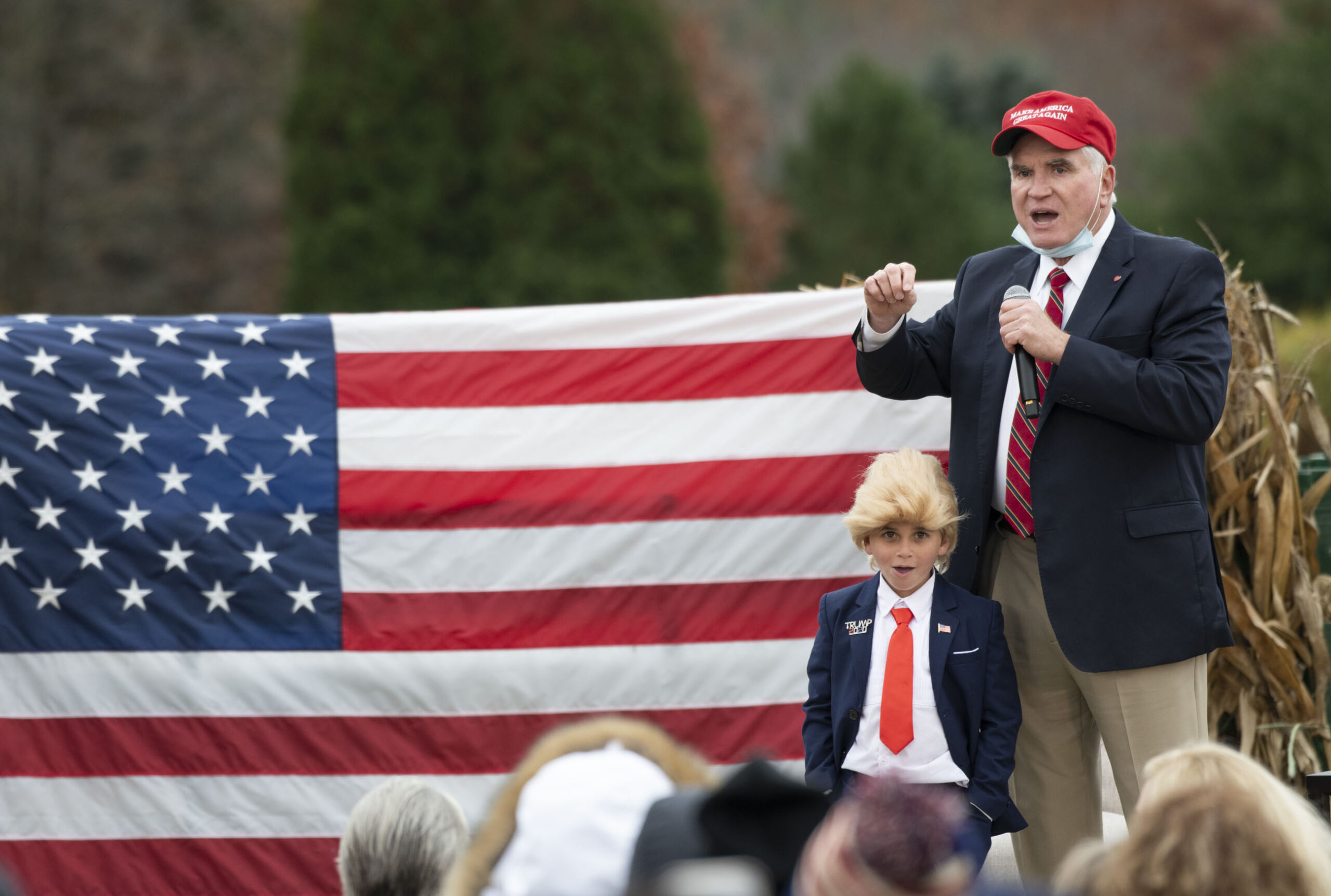 Gino Benford, 7, of Johnstown, dressed as President Donald Trump, stands on stage with Congressman Mike Kelly, representative for Pennsylvania’s 16th congressional district, before Ivanka Trump and Sarah Sanders take the stage during a “Make America Great Again!” event on Wednesday, October 28, 2020 outside Betsy’s Barn at Cheeseman Farms in Portersville. (Emily Matthews/Post-Gazette)