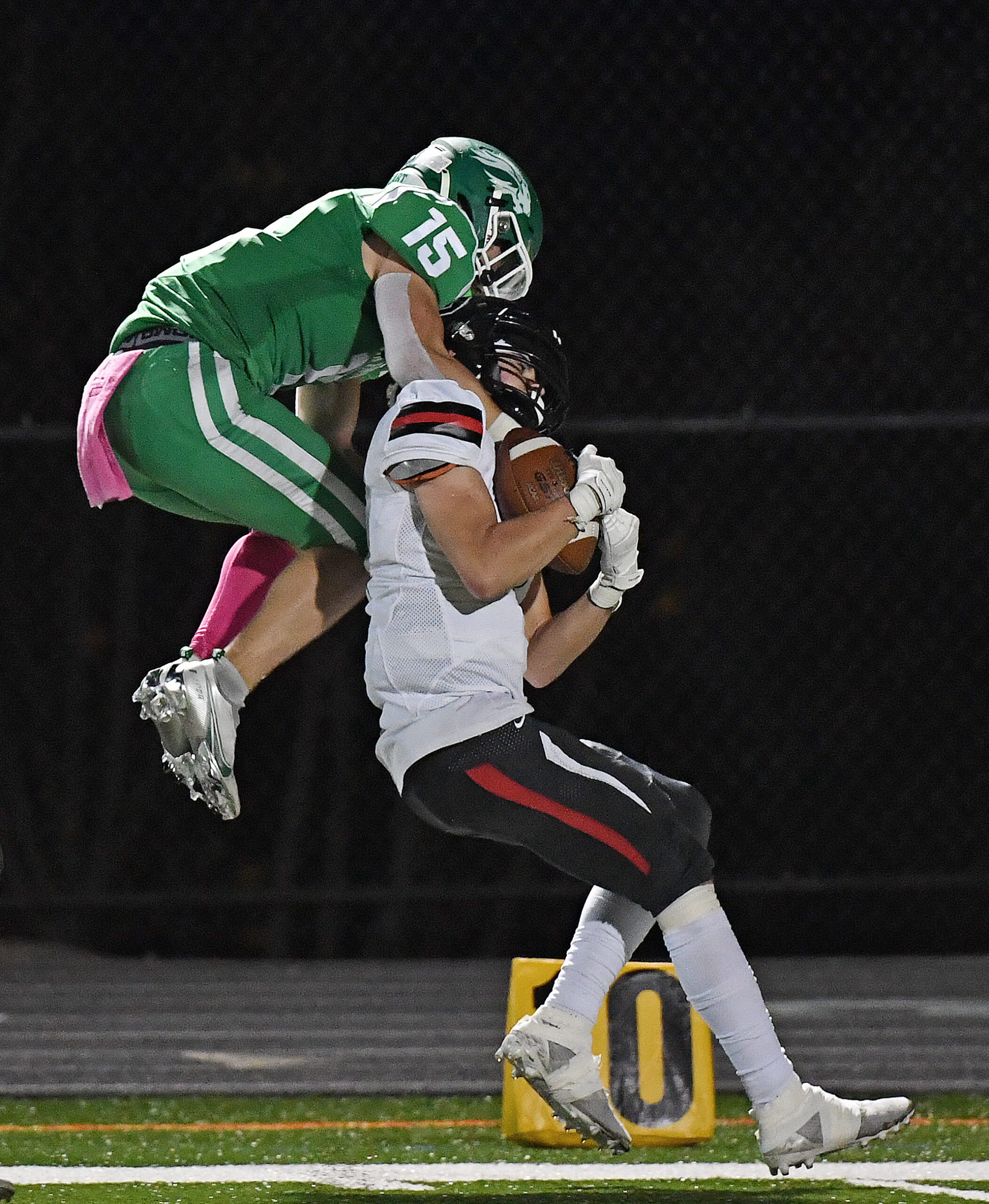 South Fayette’s Joey Audia brings down Upper St Clair’s Mateo Cepullio Friday, Oct. 23, 2020, at South Fayette Football Stadium in McDonald. (Peter Diana/Post-Gazette)