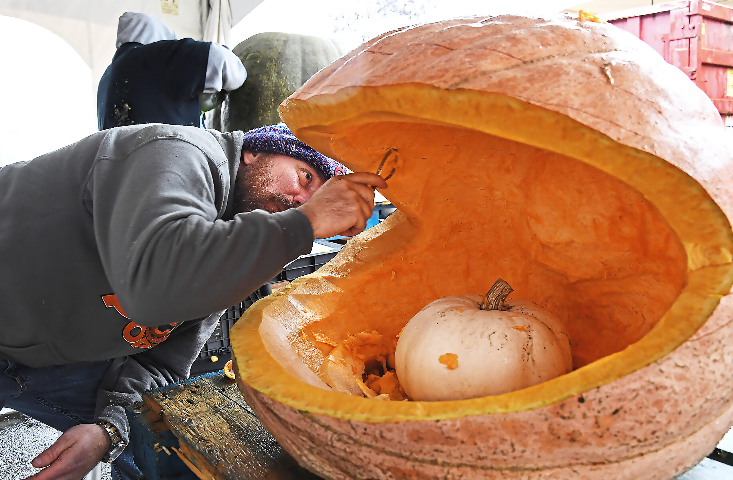 Patrick O’Brien of Asheville, North Carolina, aka the Fruit Carving Ninja, carves a clamshell in preparation for Pittsburgh Monster Pumpkins Festival Thursday, Oct. 29, 2020, at the Gold Parking Lot 1A in front of Heinz Field, Pittsburgh. The Festival starts October 30. (Peter Diana/Post-Gazette)