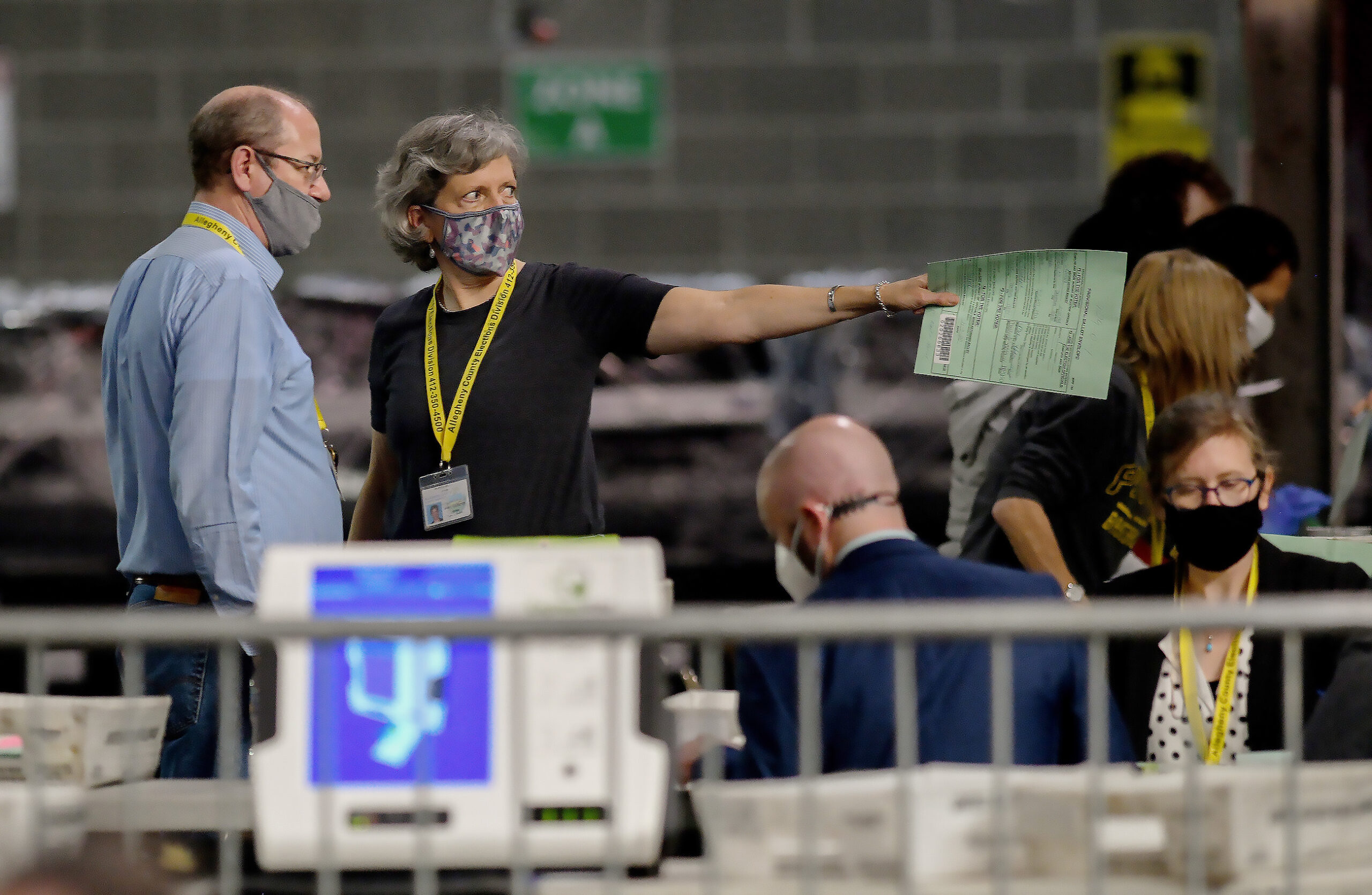 Members of the Allegheny County Return Board process the remaining absentee and mail-in Allegheny County ballots on Thursday, Nov. 12, 2020, on the North Side. (Steve Mellon/Post-Gazette via AP)