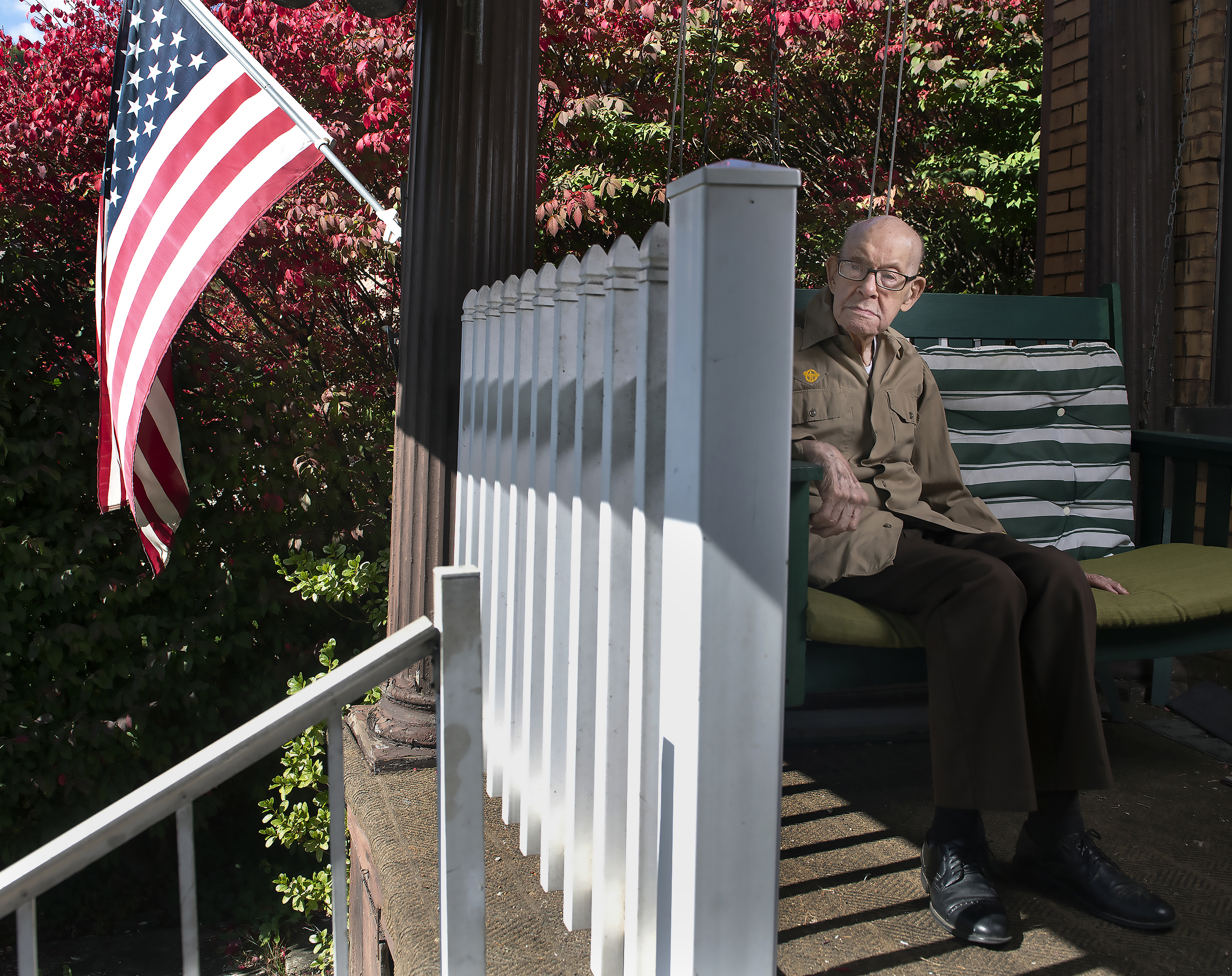 WWII veteran and former POW Rodney Chapman, who turned 99 two weeks after this portrait, poses at his home Oct. 13, 2020, in Freeport. Mr. Chapman served in France in the U.S. Army’s 30th Infantry Division. He spent 7 months and 22 days as POW in a German prison camp. He was awarded the Bronze Star and Purple Heart. (Pittsburgh Post-Gazette)