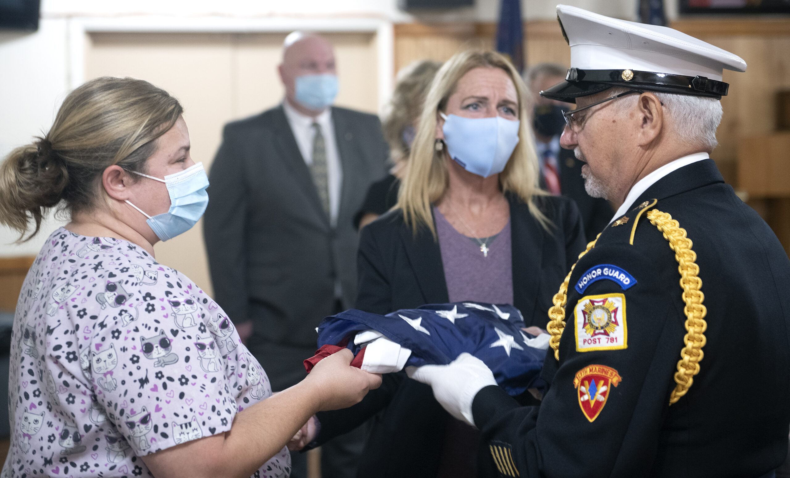 Tom Keaton, right, captain of the VFW Post 781 Honor Guard, presents the flag in honor of the late Don Kattic, longtime former commander of the VFW post, to his granddaughter, Cara Ivkovich-Falk, and daughter Leslie Kattic Quealy during a Veteran’s Day dedication ceremony Wednesday, Nov. 11, 2020, at the VFW Post 781 in North Huntingdon. Several dozen people attended the ceremony which dedicated a new flagpole and monument to the late Don Kattic. (Pittsburgh Post-Gazette)