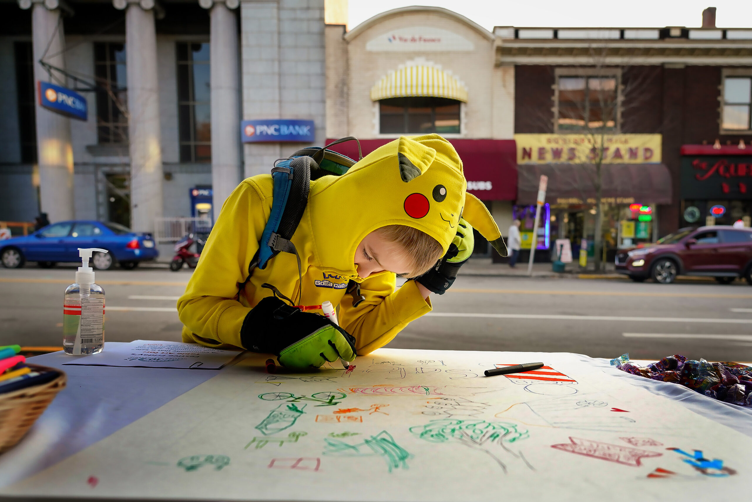 Seth Richardson, 7, of Point Breeze, works on a poster as part of a No Space for Hate community art project on Forbes Avenue in Squirrel Hill on Friday, Nov. 13, 2020. The organization 10.27 Healing Partnership set up a table and invited families to create artwork that promotes acceptance, compassion and curiosity. Four posters are currently on display at businesses along Forbes Avenue.