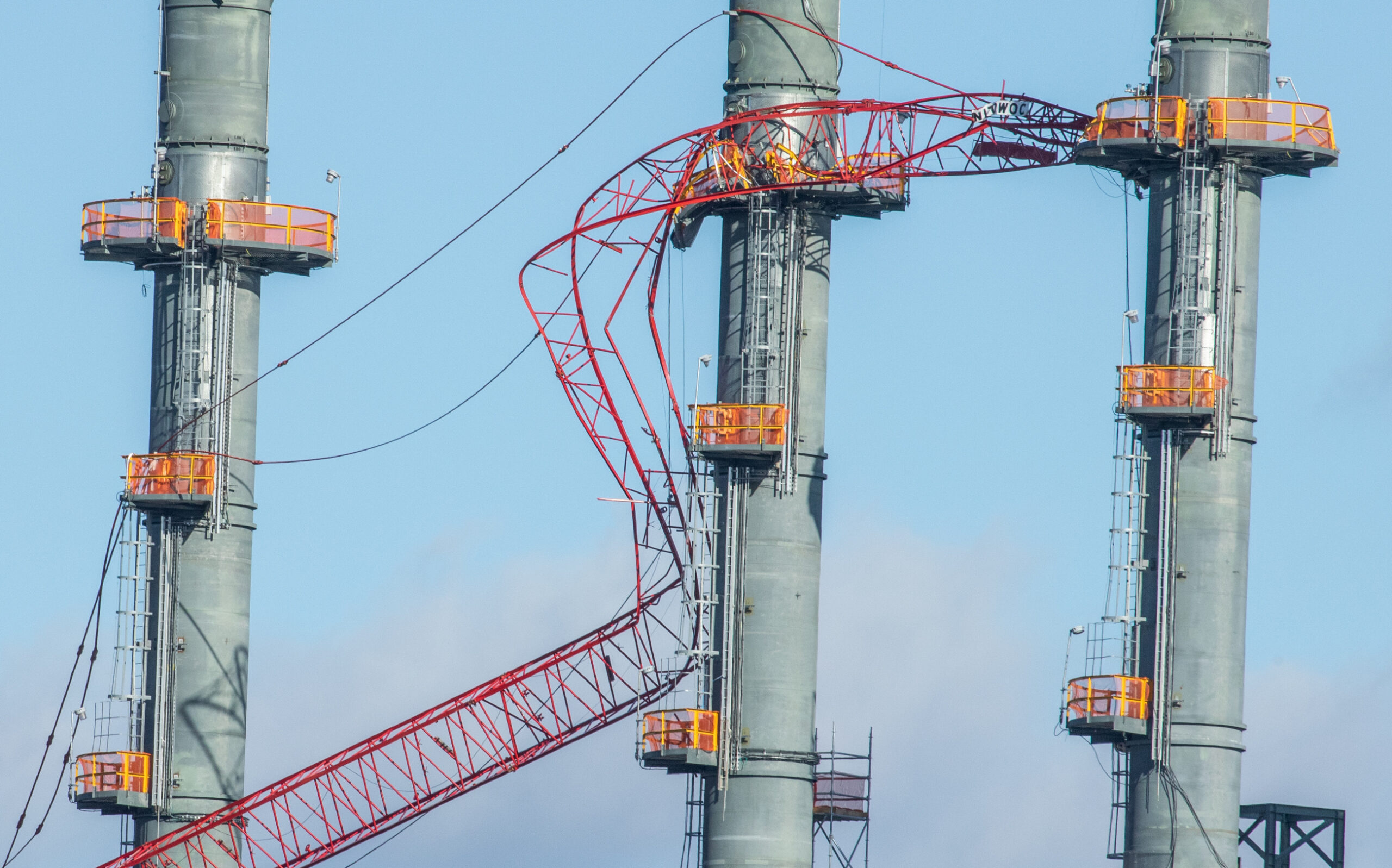 A crane at the Shell Pennsylvania Petrochemicals Complex that collapsed in strong winds on Sunday, Nov. 15, 2020, photographed on Monday, Nov. 16, 2020, in Potter Township. (Andrew Rush/Post-Gazette)
