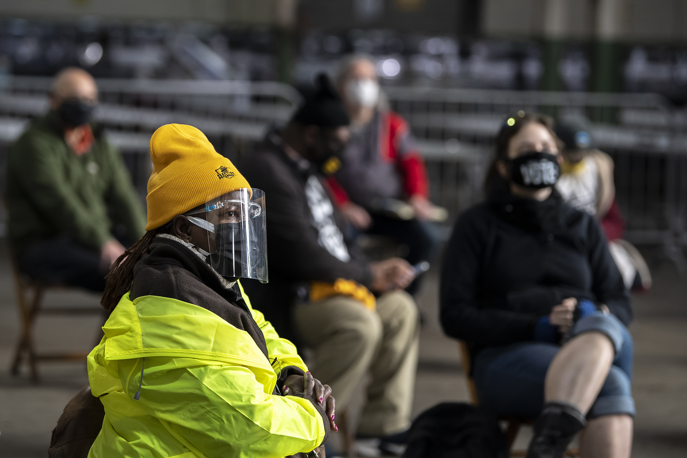 Members of a coalition of organizations, including One Pa and Pennsylvania United, working to ensure every vote gets counted in Pennsylvania, watch a screen in an overflow room for members of the public to watch a special meeting of the Allegheny County Elections Board to consider accepting challenged provisional ballots, Saturday, Nov. 14, 2020, at the Allegheny County election warehouse on the North Side. (Alexandra Wimley/Post-Gazette)