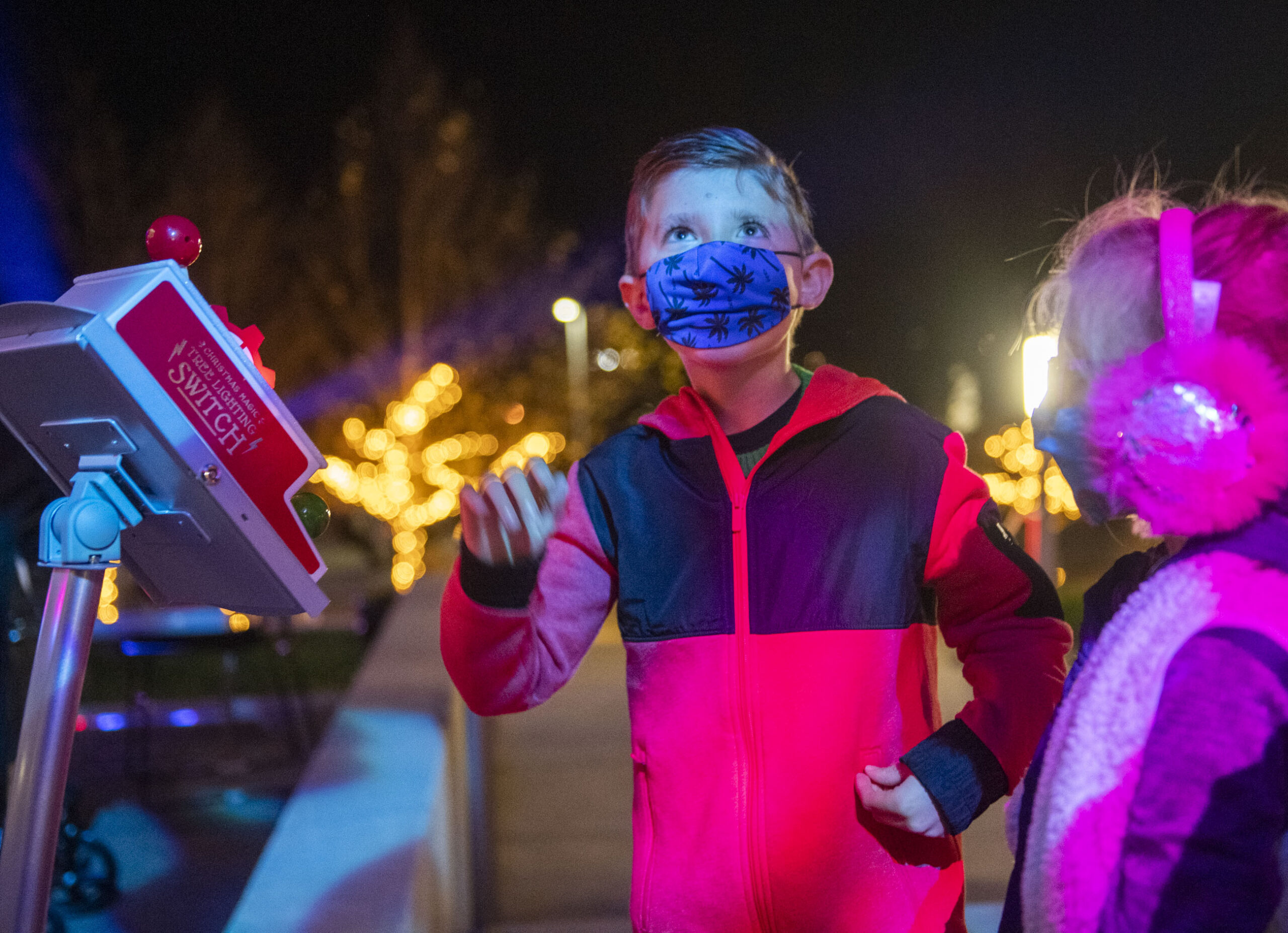 Rocco Gambone, 8, of Penn Township, looks at the light display after pulling the lever to turn them on while his sister Anna, 6, stands nearby during Winter Lights Illumination Night on Friday, November 13, 2020 at the Westmoreland Museum of American Art in Greensburg. (Emily Matthews/Post-Gazette)