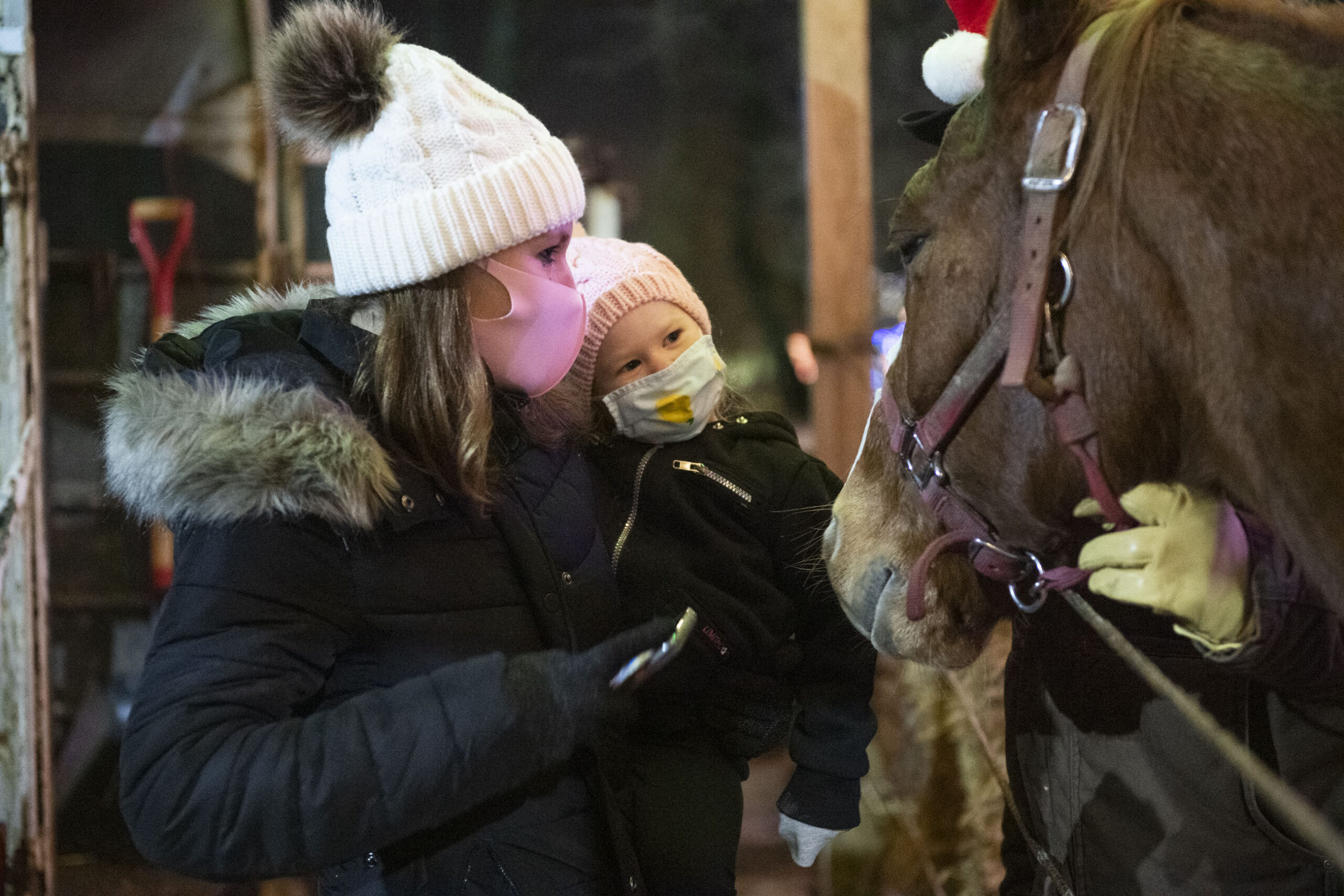 Tessa Jones and her daughter Daisy Jones, 3, of Moon Township, look at Dixie the horse during the Moon Lights Holiday Festival on Saturday, December 5, 2020, at Moon Park in Moon Township. (Emily Matthews/Post-Gazette)
