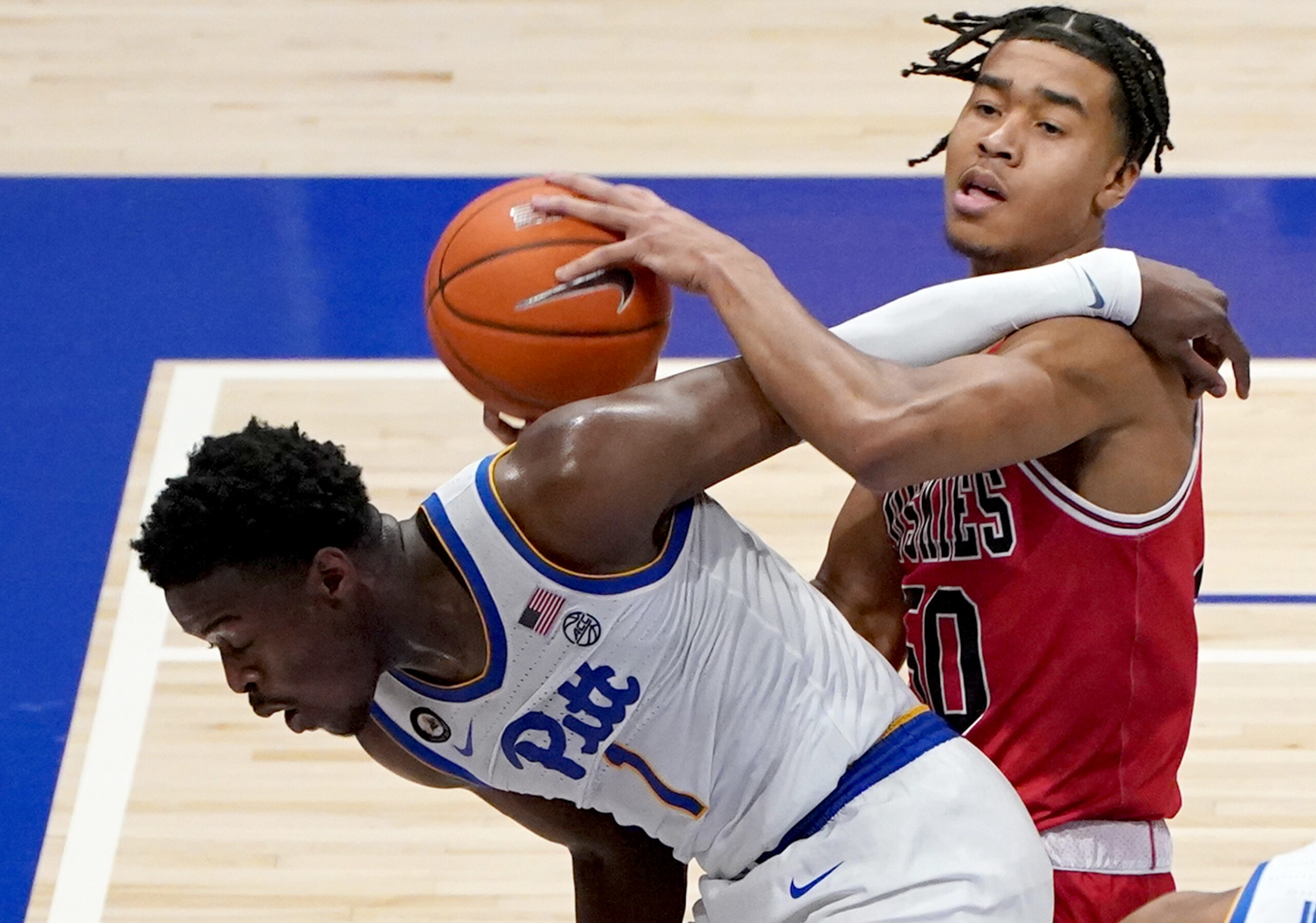 Pitt guard Xavier Johnson gets wrapped up under the basket with Northern Illinois guard Anthony Crump in the second half at Petersen Events Center Saturday, Dec. 5, 2020, in Pittsburgh. (Matt Freed/Post-Gazette)