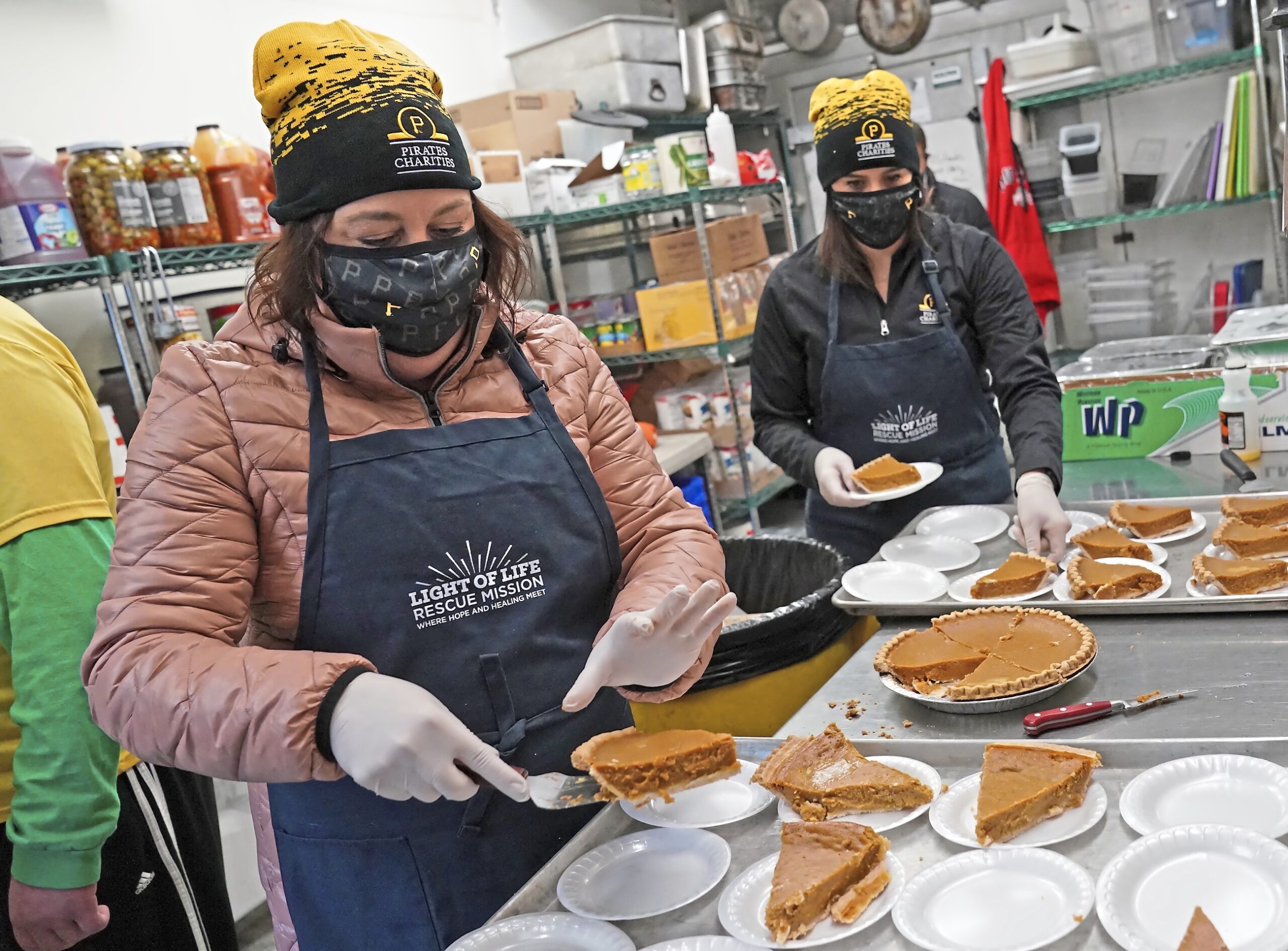 Christine Serkoch, Pirates director of special events, along with Sarah Jugovic, Pirates Charities coordinator, cut pumpkin pie at Light of Life Rescue Mission on the North Side Thursday, Dec. 10, 2020, in Pittsburgh. Pirates charities donated a check for $13,750 to the charity. (Matt Freed/Post-Gazette)