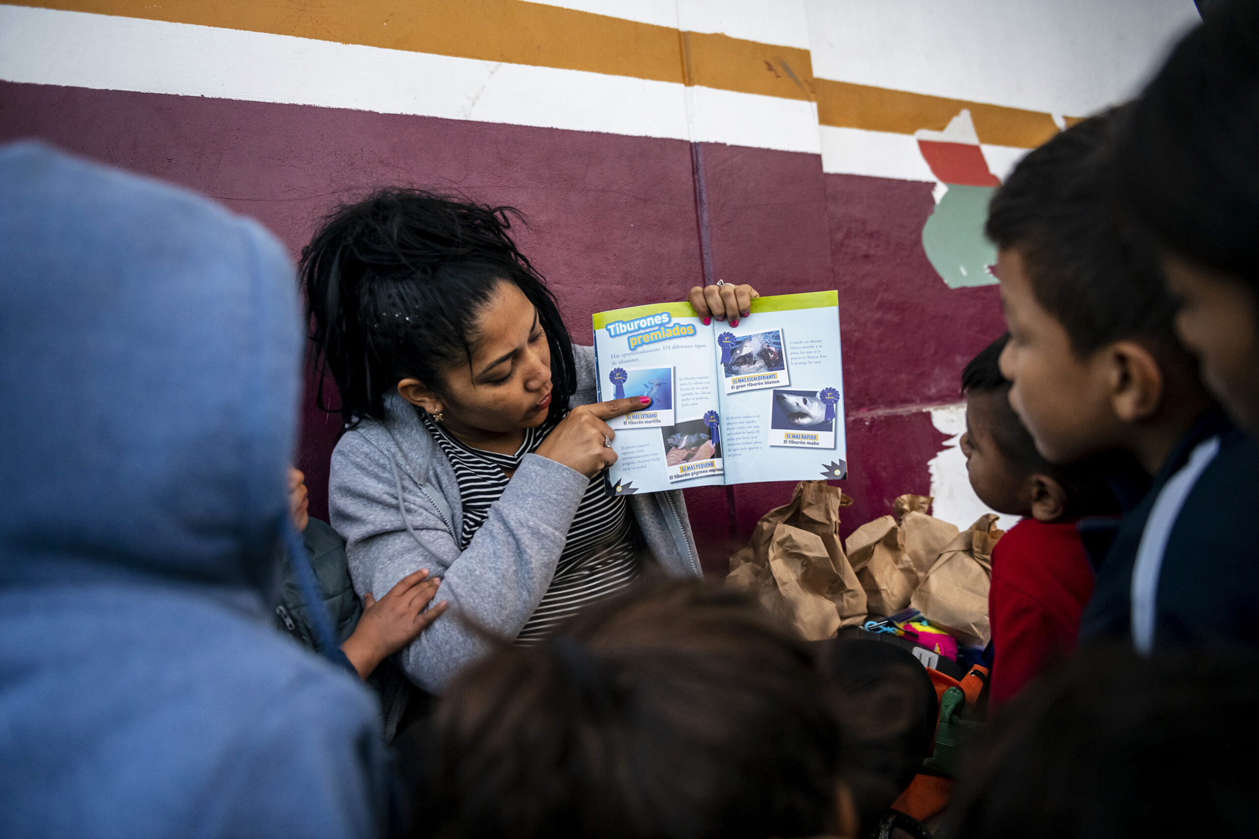 Elizabeth Despaigne, an asylum seeker from Cuba, is surrounded by students as she gives a lesson on sharks at the Sidewalk School for Children Asylum Seekers, Monday, Jan. 20, 2020, in Matamoros, Mexico. The school pays experienced teachers who are displaced to lesson plan and organize the school, which provides lunch and lessons for the camp’s children three days a week. (Michael M. Santiago/Post-Gazette) #worthmanifesto