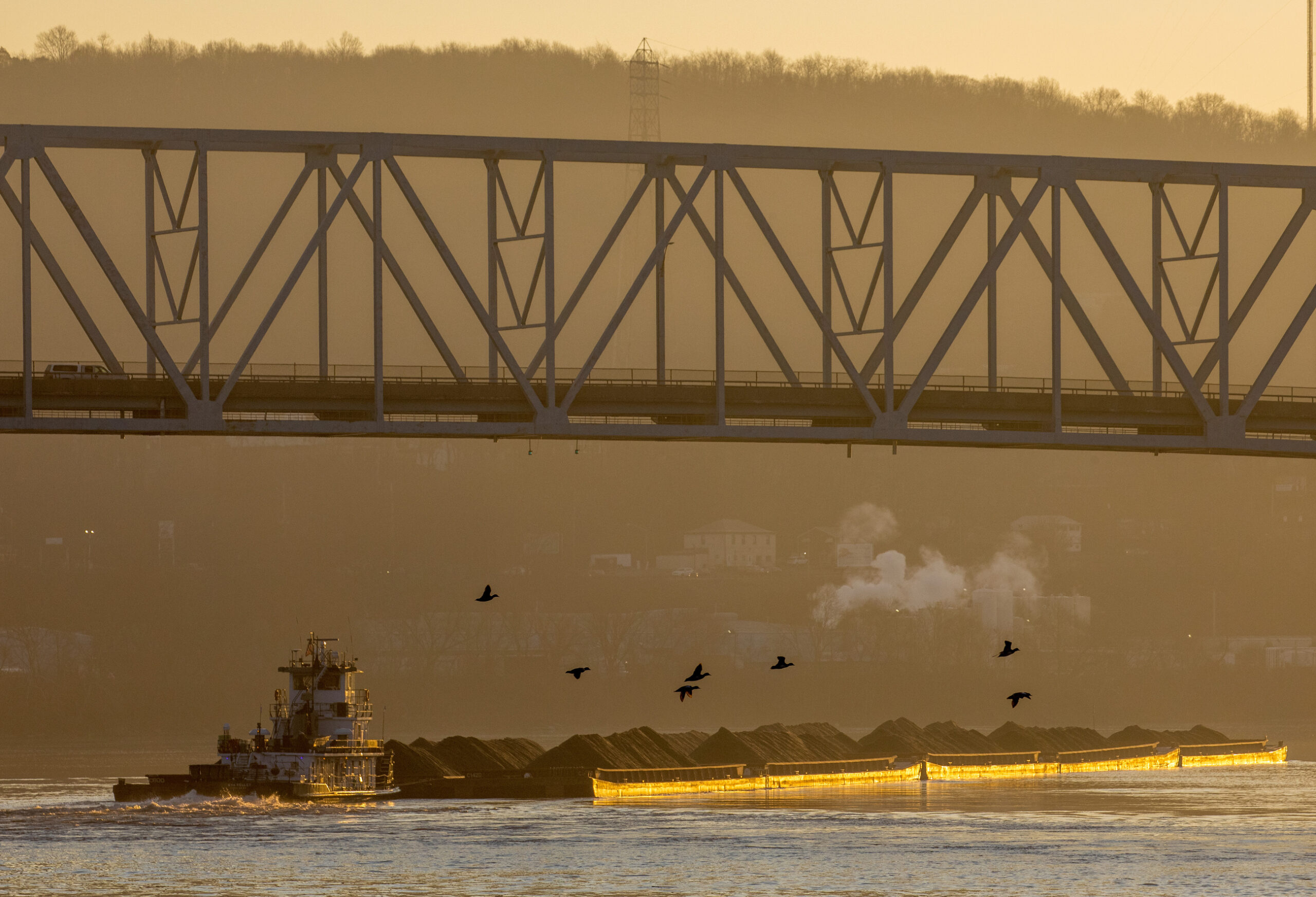 A tugboat pushes coal barges up the Ohio River under the Rochester Monaca Bridge on Friday, Feb. 26, 2021 in Monaca. (Andrew Rush/Post-Gazette)