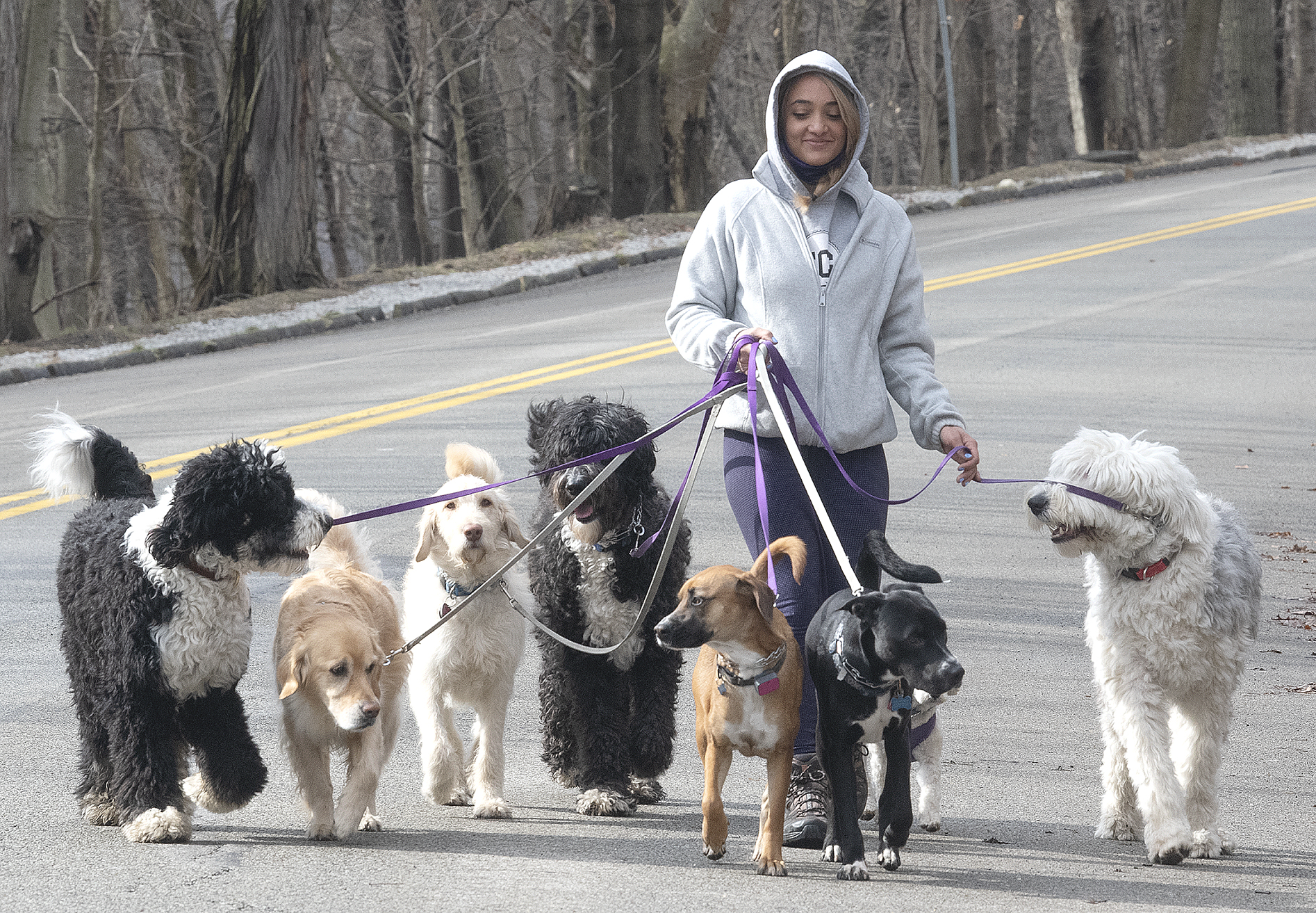 20210301ng_Standalone02 March 2, 2021 • 1894 × 1313 • Week in Photos: Feb. 28-March 6 (PLEASE WITHHOLD MY BYLINE/CREDIT.) #Standalone. Kiah Harrington-Wymer an employee of Go Dog Go in Regent Square walk dogs Monday, March 1, 2021, in Schenley Park. (Nate Guidry/Post-Gazette)