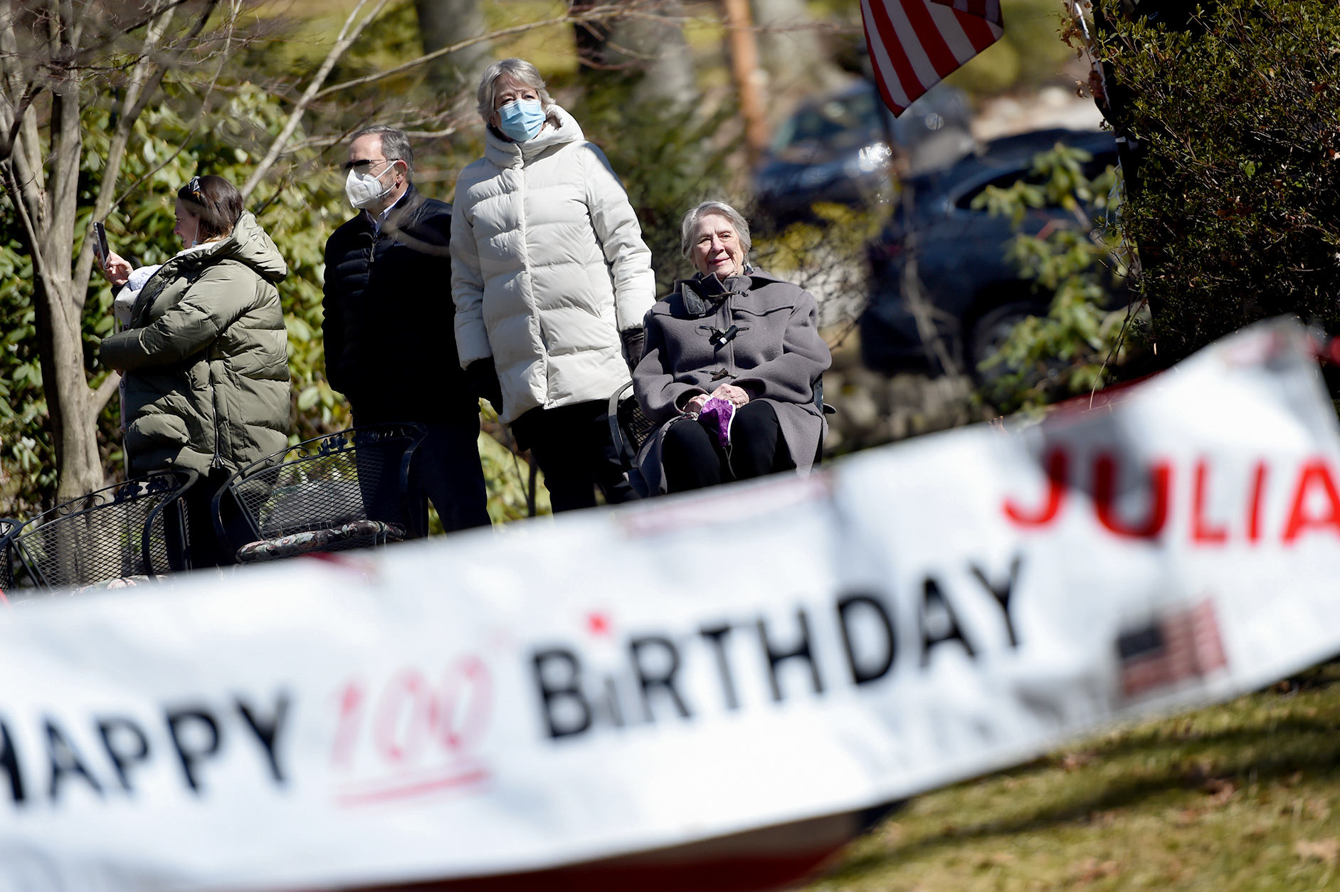 Julia Parsons (seated), a retired Navy veteran of the Navy WAVES (Women Accepted for Volunteer Service) celebrates her 100th Birthday in front of her home watching the parade in her honor with her daughter, Margaret Breines and other family members, Tuesday, March 2, 2021 in Forest Hills. Organized by the Veterans Breakfast Club, first responders, veterans, civilians and servicemen paraded by Parsons’ home in honor of her 100th birthday & her service as a codebreaker during WWII. (Pam Panchak/Post-Gazette)