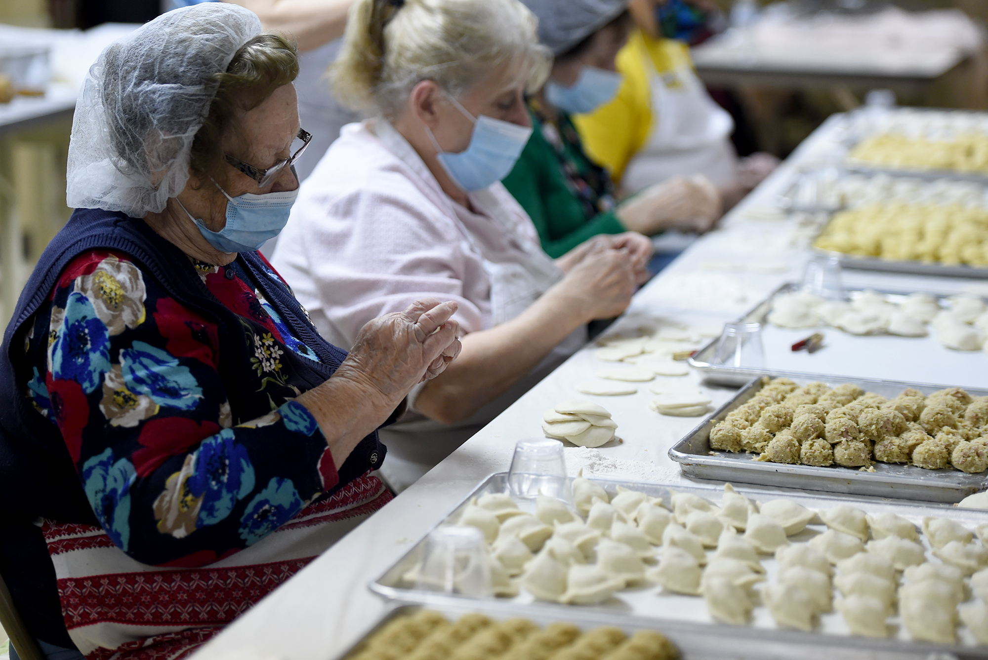Katherine Dziadyk from Baldwin and Mary Kozikowski from the South Side patiently pinch the edges of the pyrohy filling trays and trays of pyrohy Wednesday, Mar. 3, 2021 Pittsburgh. (Pam Panchak/Post-Gazette)