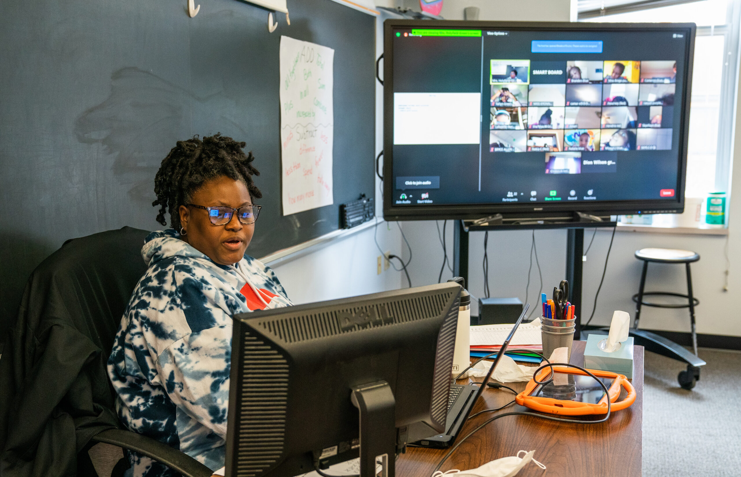 Tanya Holyfield, a second grade teacher with Manchester Academic Charter School, teaches remote students from her classroom on Thursday, March 4, 2021, in Manchester. The school is planning to return students to the classroom in a hybrid schedule at the end of March. (Andrew Rush/Pittsburgh Post-Gazette via AP)