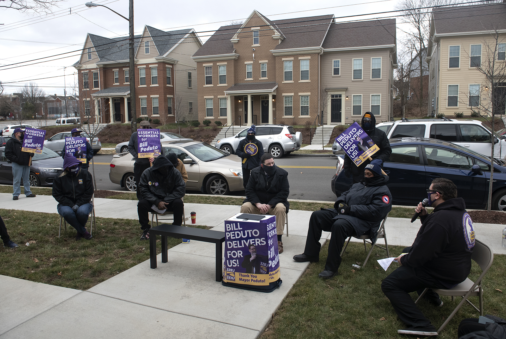 For Local. Pittsburgh Mayor Bill Peduto, center, field questions from members of the 32BJ SEIU after they announced their endorsement of Peduto for re-election Thursday, March 4, 2021, at the Kelly Hamilton Houses in Homewood. (Nate Guidry/Post-Gazette)