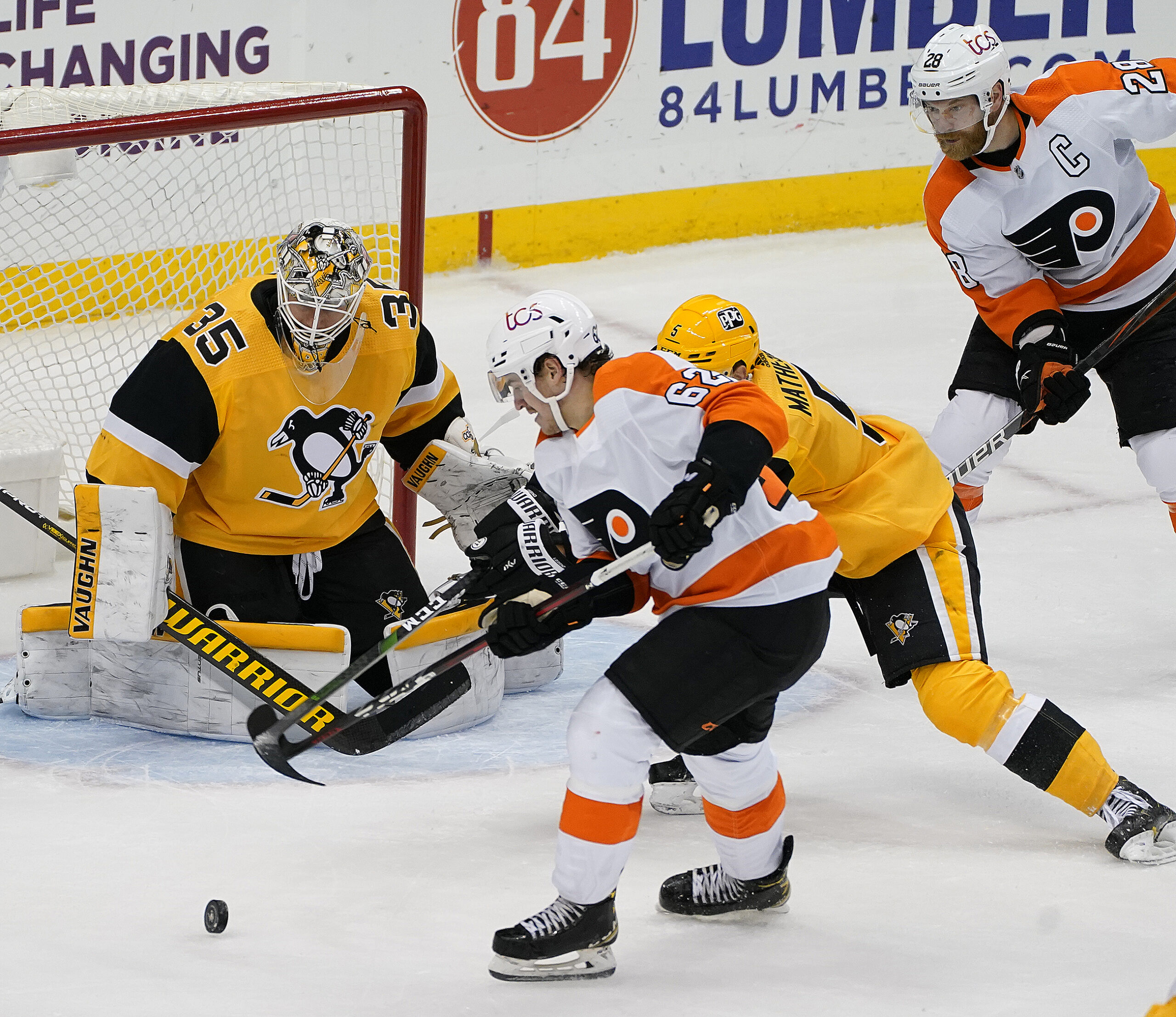 Flyers right wing Nicolas Aube-Kubel sets up Claude Giroux for the game winner late in the third period beating Penguins goaltender Tristan Jarry Thursday, March. 4, 2021, at PPG Paints Arena in Pittsburgh. (Peter Diana/Post-Gazette)