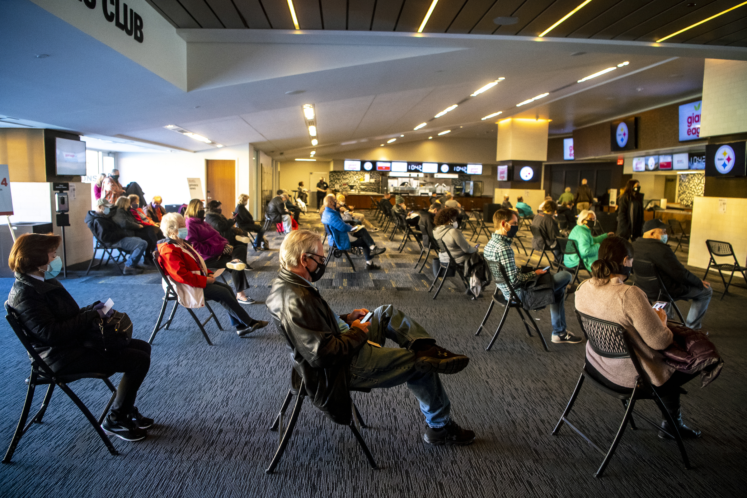 People wait for an observation period after receiving the Pfizer-BioNTech COVID-19 vaccine at a clinic organized by Giant Eagle in partnership with the Steelers at Heinz Field, Tuesday, March 2, 2021, on the North Shore. (Alexandra Wimley/Post-Gazette)