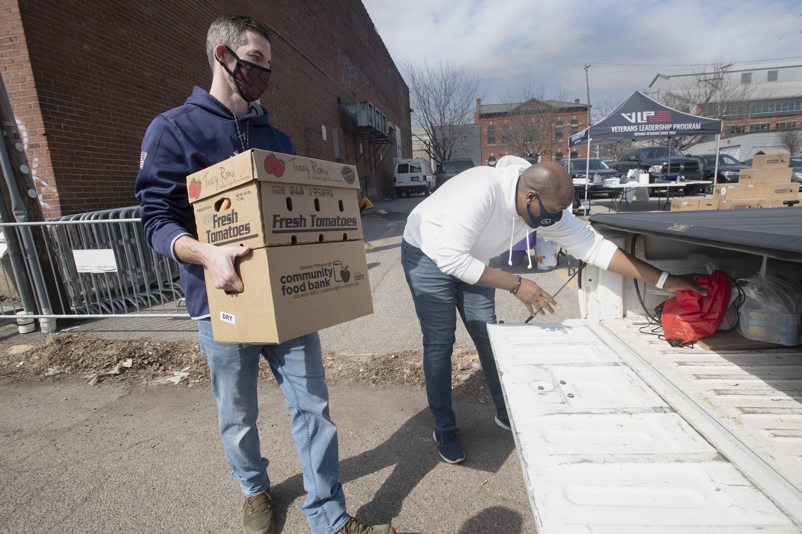 Josh Fisher, from Homestead and Timothy Jones from Brighton Heights load boxes of goods into a truck during the Veterans Leadership Program’s monthly Military Share Food Distribution at their Strip District location Monday, Mar. 8, 2021 in Pittsburgh. The VLP teamed up with the Greater Pittsburgh Community Food Bank to distribute food and other essentials. (Pam Panchak/Post-Gazette)