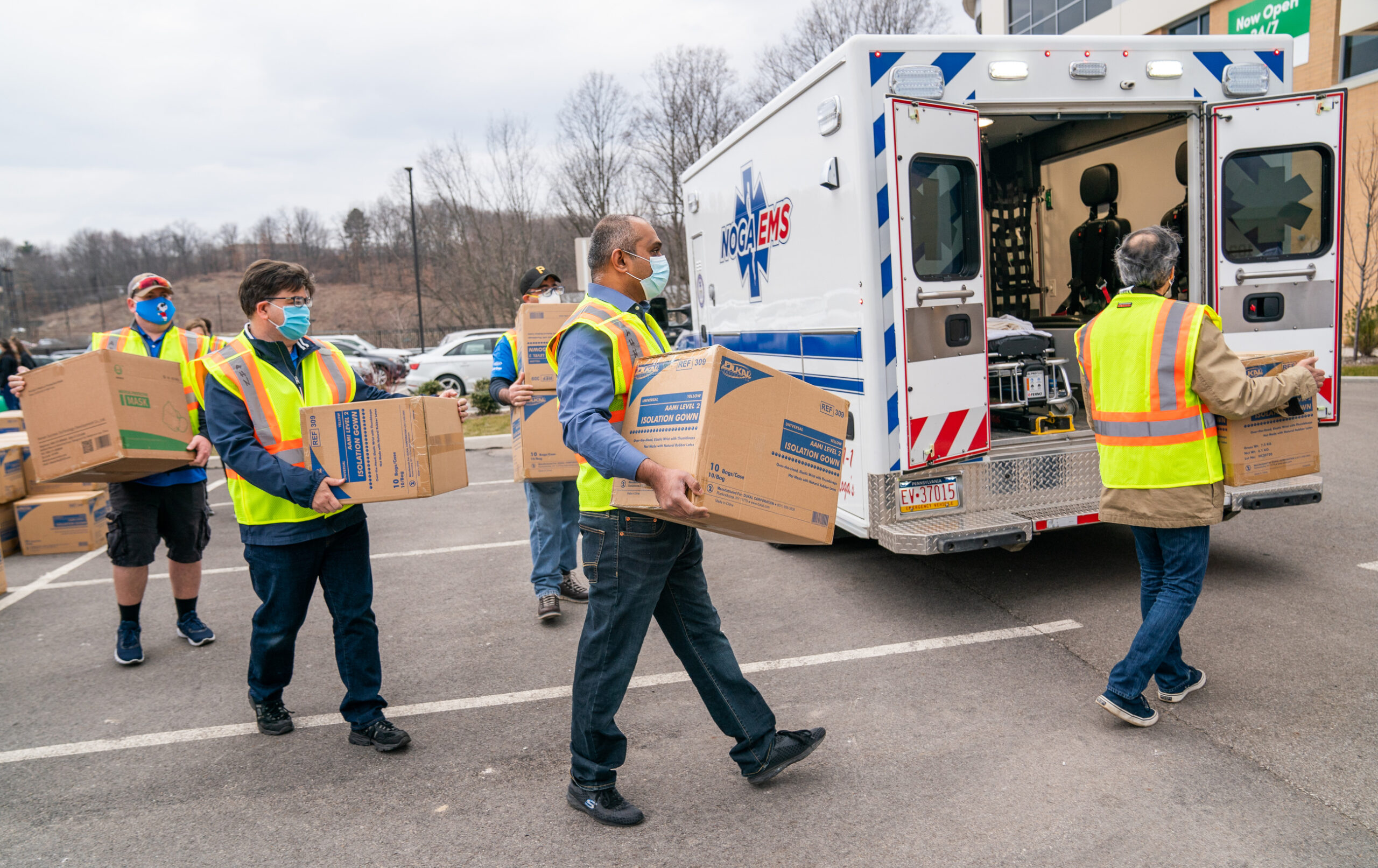 Allegheny Health Network employees load boxes of Personal Protective Equipment (PPE) for local EMS agencies during a drive-up event at AHN McCandless Neighborhood Hospital on Thursday, March 11, 2021. Todays distribution included N95 masks, surgical masks, face shields and surgical gowns. (Andrew Rush/Post-Gazette)
