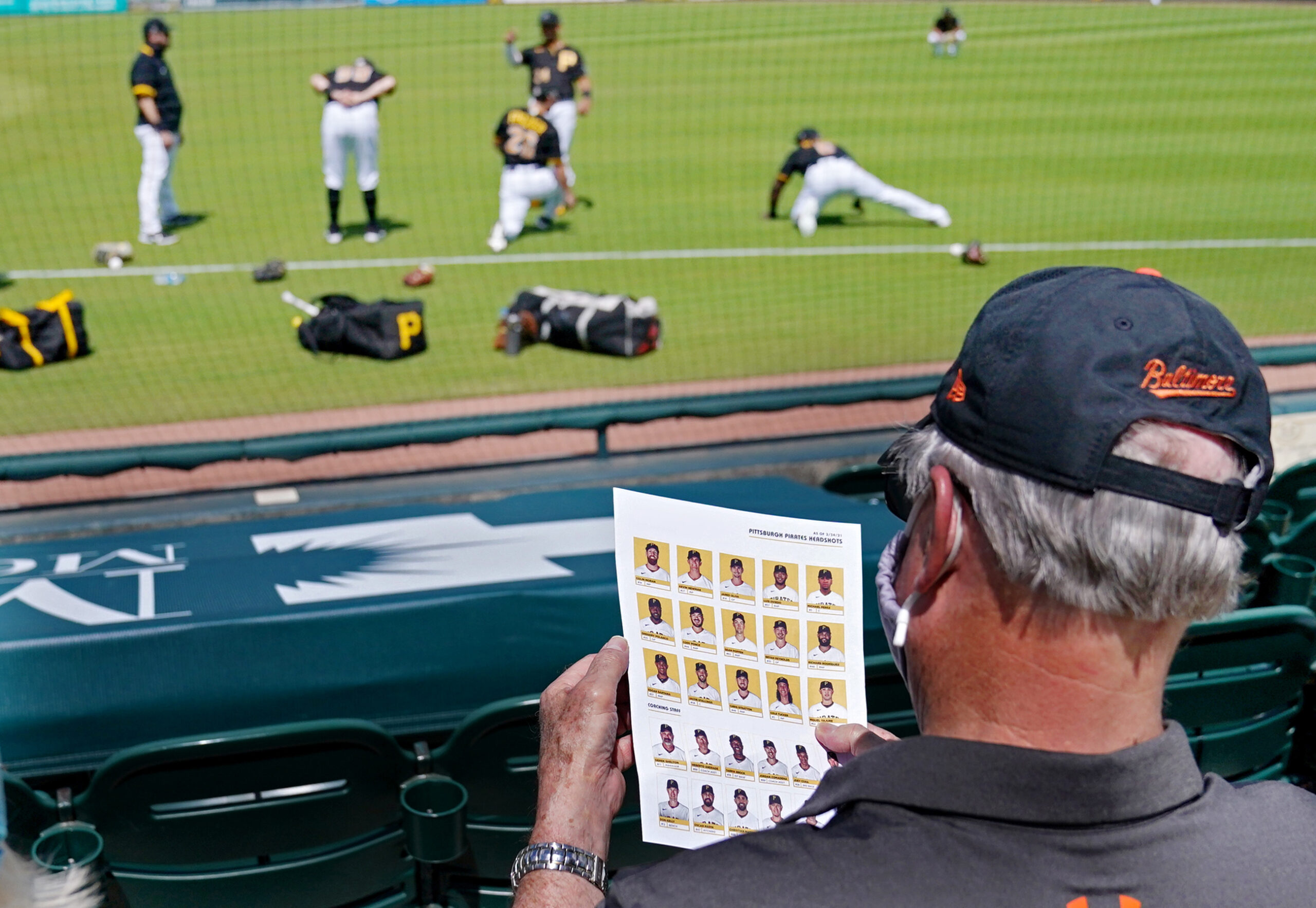 An Orioles fan takes a look at the Pittsburgh Pirates faces before the teams play Thursday, March 11, 2021, at LECOM Park in Bradenton, Fla. (Matt Freed/Post-Gazette)