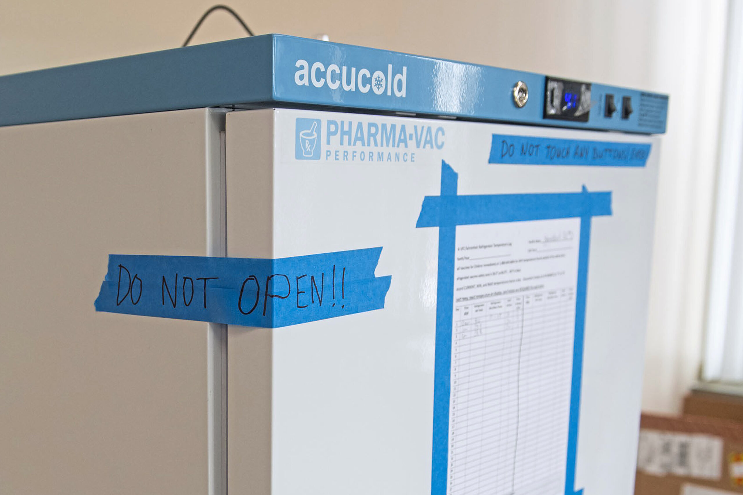 A refrigerator where the Johnson & Johnson vaccine is being stored can be seen on Wednesday, March 10, 2021, at the Allegheny Intermediate Unit in Homestead. The AIU will be offering the vaccine to school personnel who work in school districts within Allegheny County starting March 11 until March 17. (Emily Matthews/Post-Gazette)