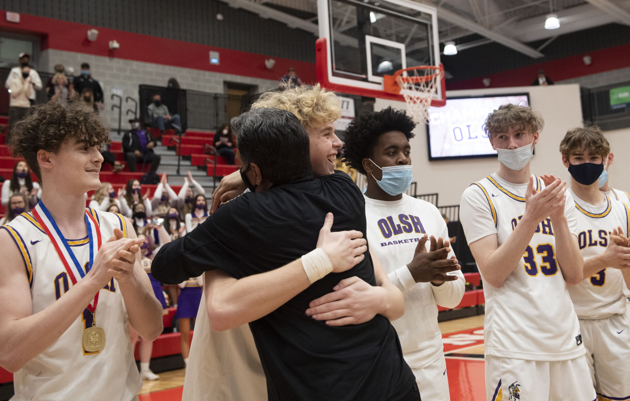 Our Lady of the Sacred Heart’s Bryson Kirschner hugs Head Coach Mike Rodriguez as their medals and handed out for their 71-52 victory against Greensburg Central Catholic during the Class 2A WPIAL championship game on Saturday, March 13, 2021, at Peters Township High School. OLSH won 71-52. (Emily Matthews/Post-Gazette)