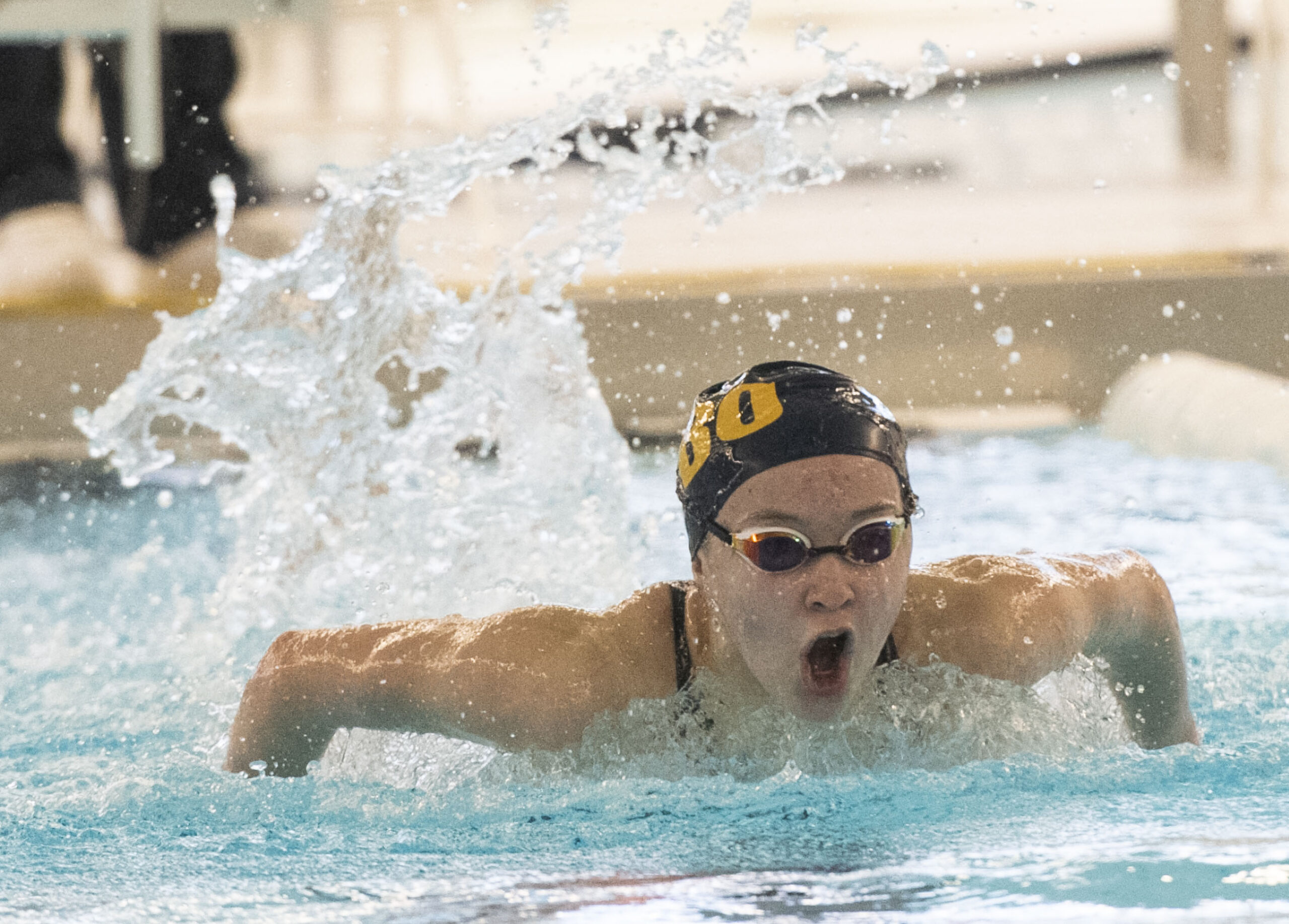 Mt. Lebanon’s Adrienne Hagins competes in the girls 100 fly during the WPIAL Class 3A swimming championships on Sunday, March 7, 2021, at Upper St. Clair High School. (Emily Matthews/Post-Gazette)