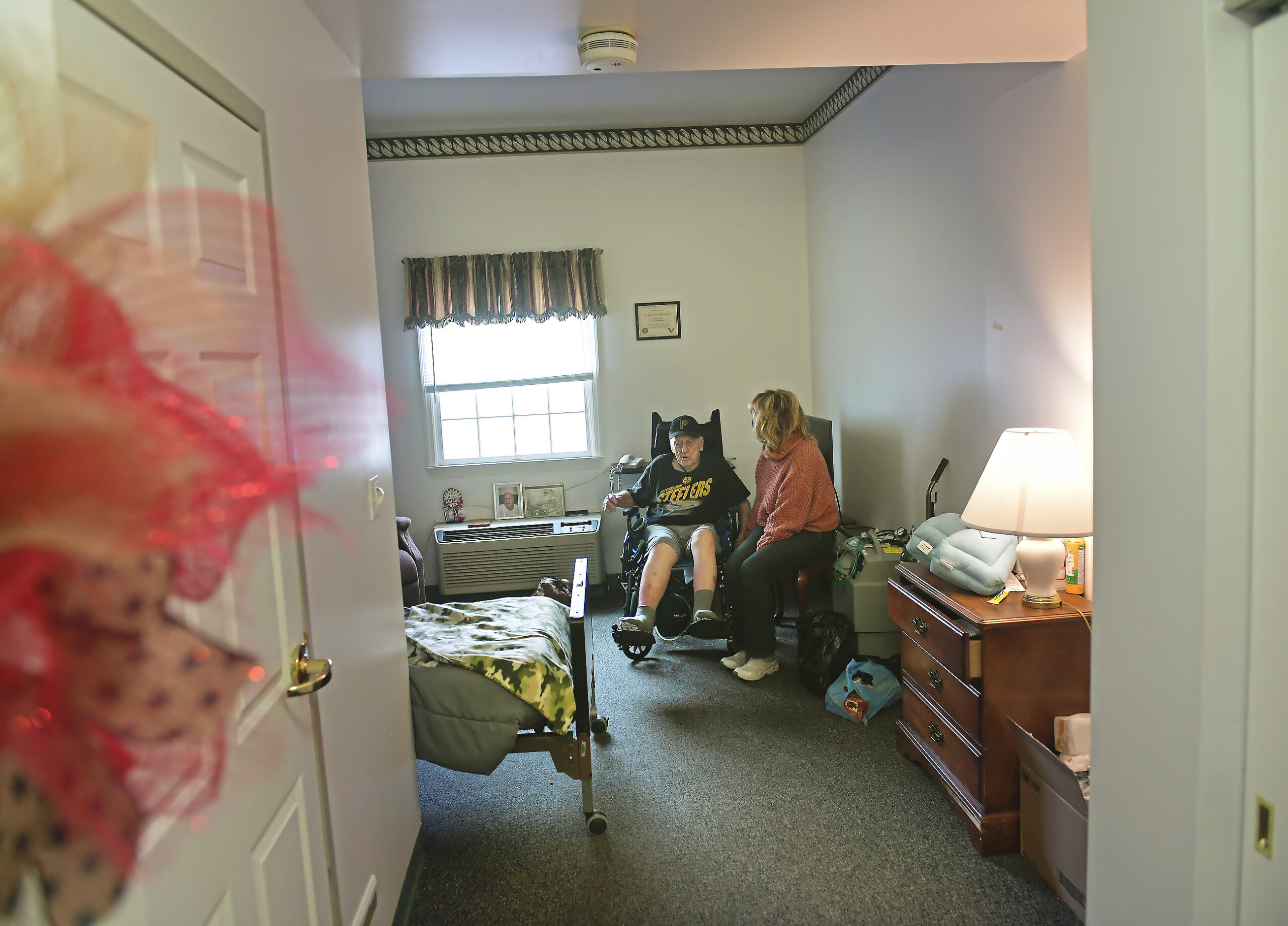 (PLEASE WITHHOLD MY BYLINE/CREDIT.) #For Local. Cherrie Rastoka, 64, of Bentleyville, visits with her father Ernest Flick, 91, originally of Brownsville, Thursday, March 25, 2021, at The Residence at Hilltop in Carroll Township, Washington County. This is the first time Rastoka has been able to visit her father in his private room at the resident facility. (Nate Guidry/Post-Gazette)