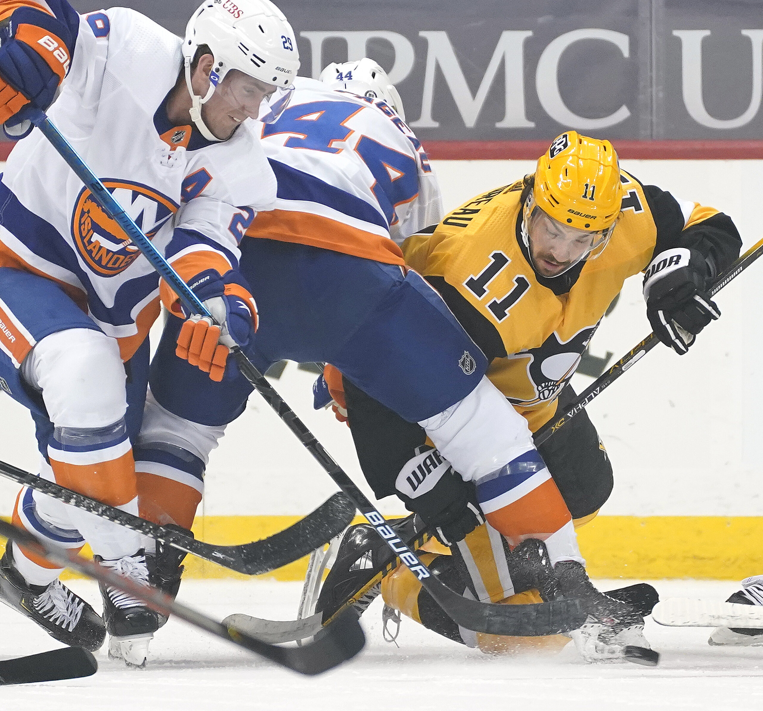 20210327pdPenguins04 March 27, 2021 • 2560 × 2383 • Week in Photos: March 21-27 Penguins center Frederick Gaudreau battles Islanders center Jean-Gabriel Pageau for loose puck Saturday, March 27, 2021, at PPG Paints Arena in Pittsburgh. (Peter Diana/Post-Gazette)