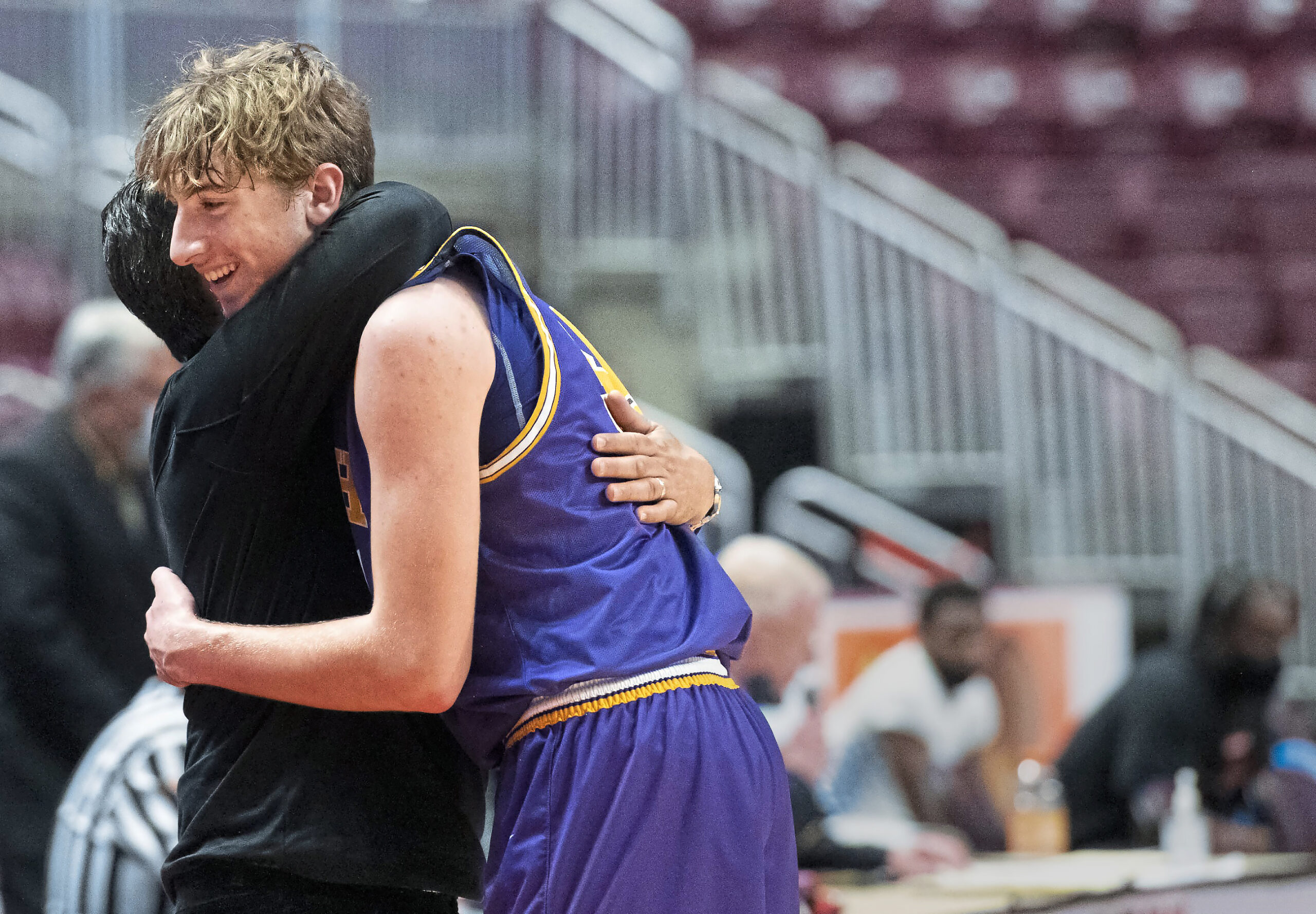 Our Lady of the Sacred Heart’s Dawson Summers hugs head coach Mike Rodriguez near the end of the PIAA 2A championship game against Constitution on Friday, March 26, 2021, at Giant Center in Hershey. OLSH won 62-49 and had a perfect 24-0 season. (Emily Matthews/Post-Gazette)