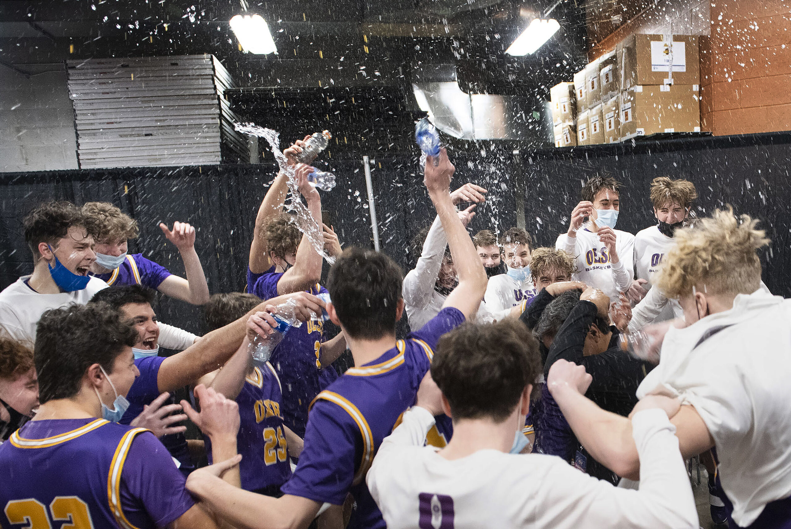 Our Lady of the Sacred Heart High School celebrates by throwing water on head coach Mike Rodriguez after defeating Constitution High School 62-49 in the PIAA 2A championship game against on Friday, March 26, 2021, at Giant Center in Hershey. OLSH had a perfect 24-0 season. (Emily Matthews/Post-Gazette via AP)